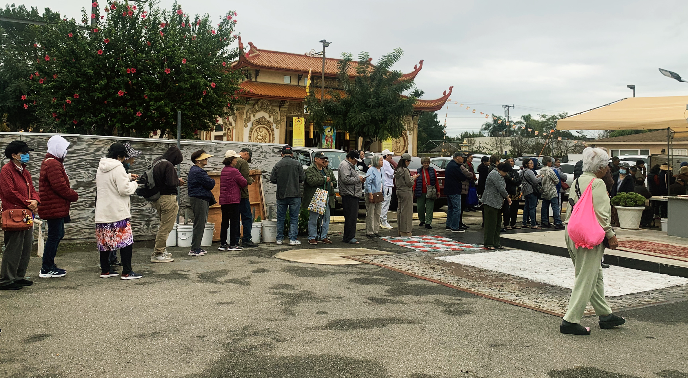 Đồng hương Phật tử xếp hàng nhận lộc đầu năm mới 2026, tại chùa Huệ Quang. (Hình: Lâm Hoài Thạch/Người Việt)