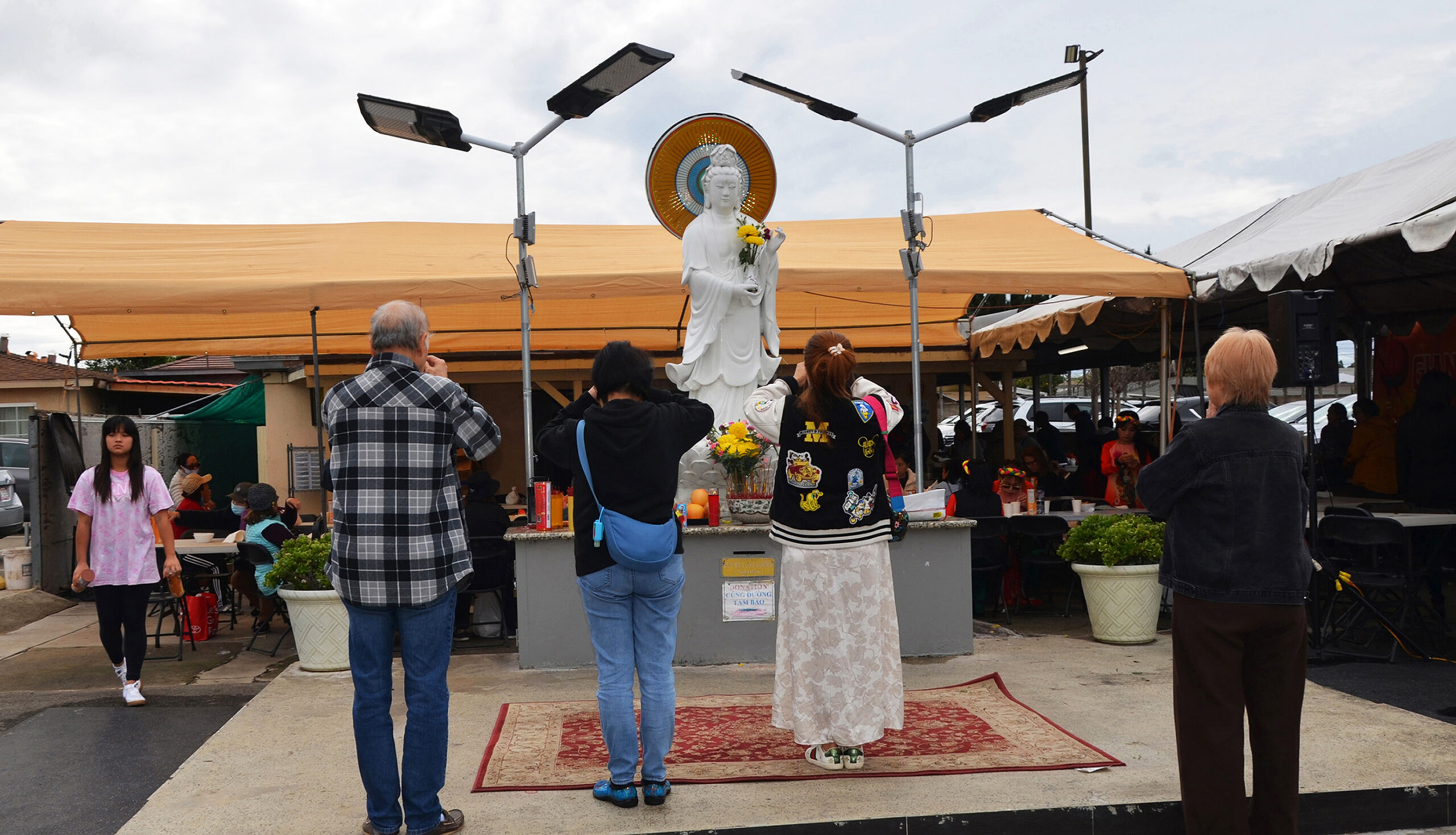 Phật tử đến thắp hương tại tôn tượng Quán Thế Âm trong khuôn viên tổ chức. (Hình: Lâm Hoài Thạch/Người Việt)