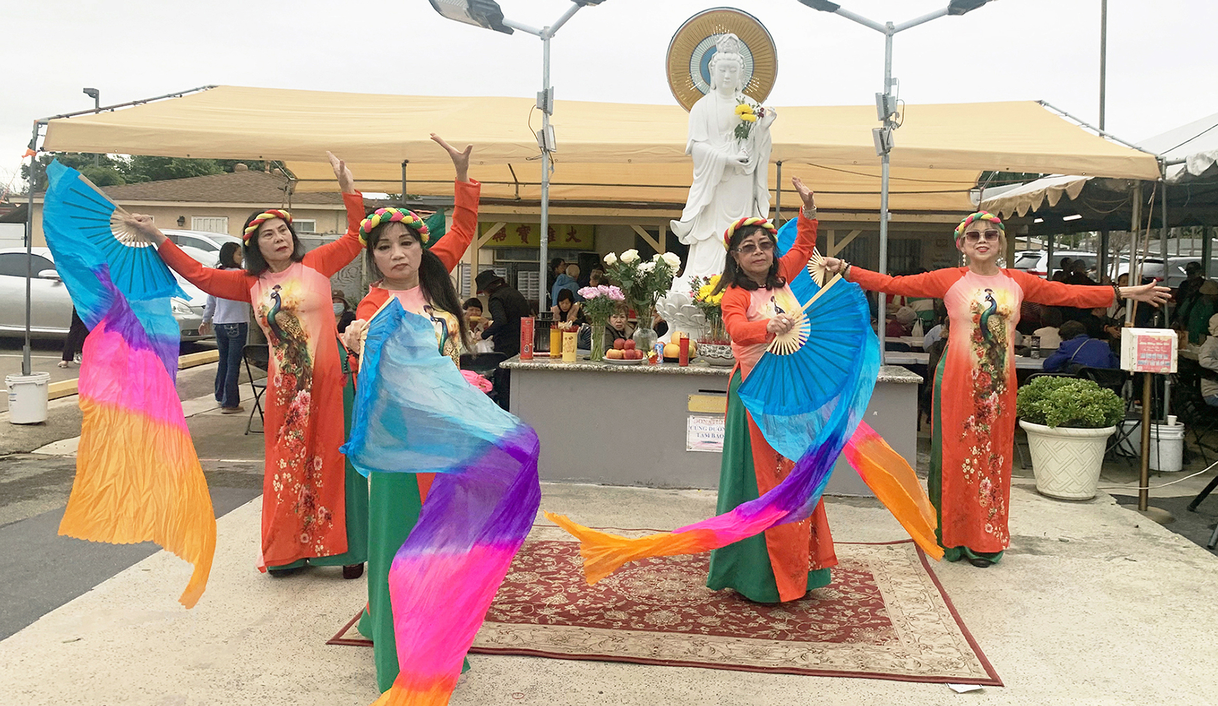 Ban Diệu Âm múa mừng New Year 2026 tại chùa Huệ Quang. (Hình: Lâm Hoài Thạch/Người Việt)