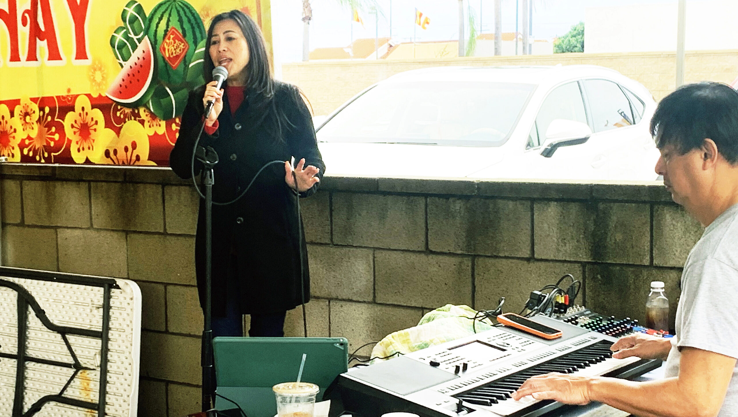 Phần trình diễn của ca sĩ Yến Phương (trái) và nhạc sĩ Mạnh Hùng. (Hình: Lâm Hoài Thạch/Người Việt)