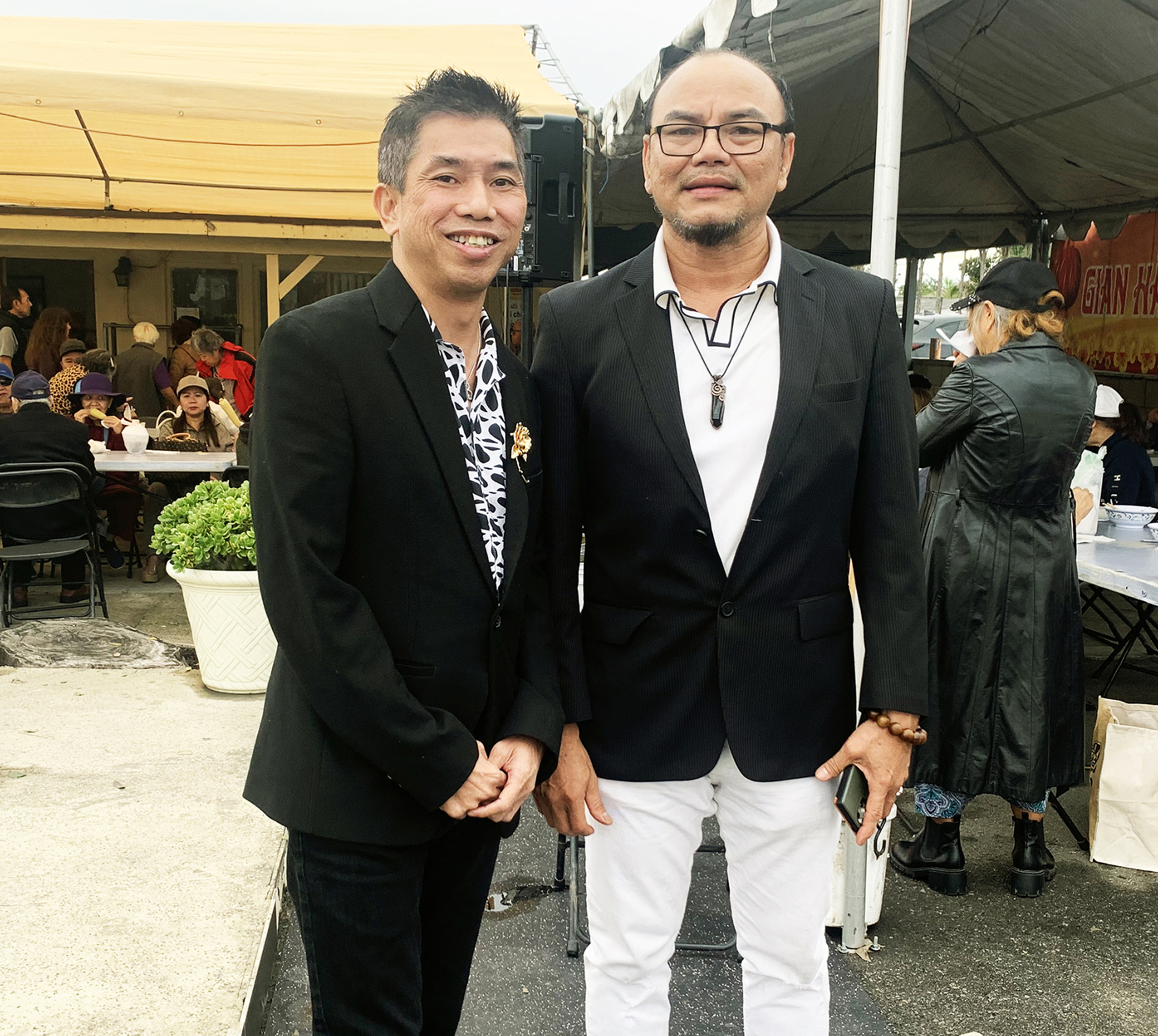 Hai ca sĩ, Tony Ngô (trái) và Hoàng Cương, đến hát cúng dường. (Hình: Lâm Hoài Thạch/Người Việt)