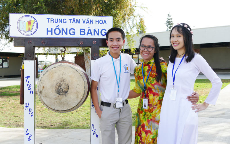 Ba phụ giáo trẻ xuất sắc của Trung Tâm Việt Ngữ Hồng Bàng, từ trái, Nguyễn Đức Hoàn Mỹ Maxwell, Phan Ngọc Liên Chi, và Hoàng Trần Bảo Thy Traccy. (Hình: Văn Lan/Người Việt)
