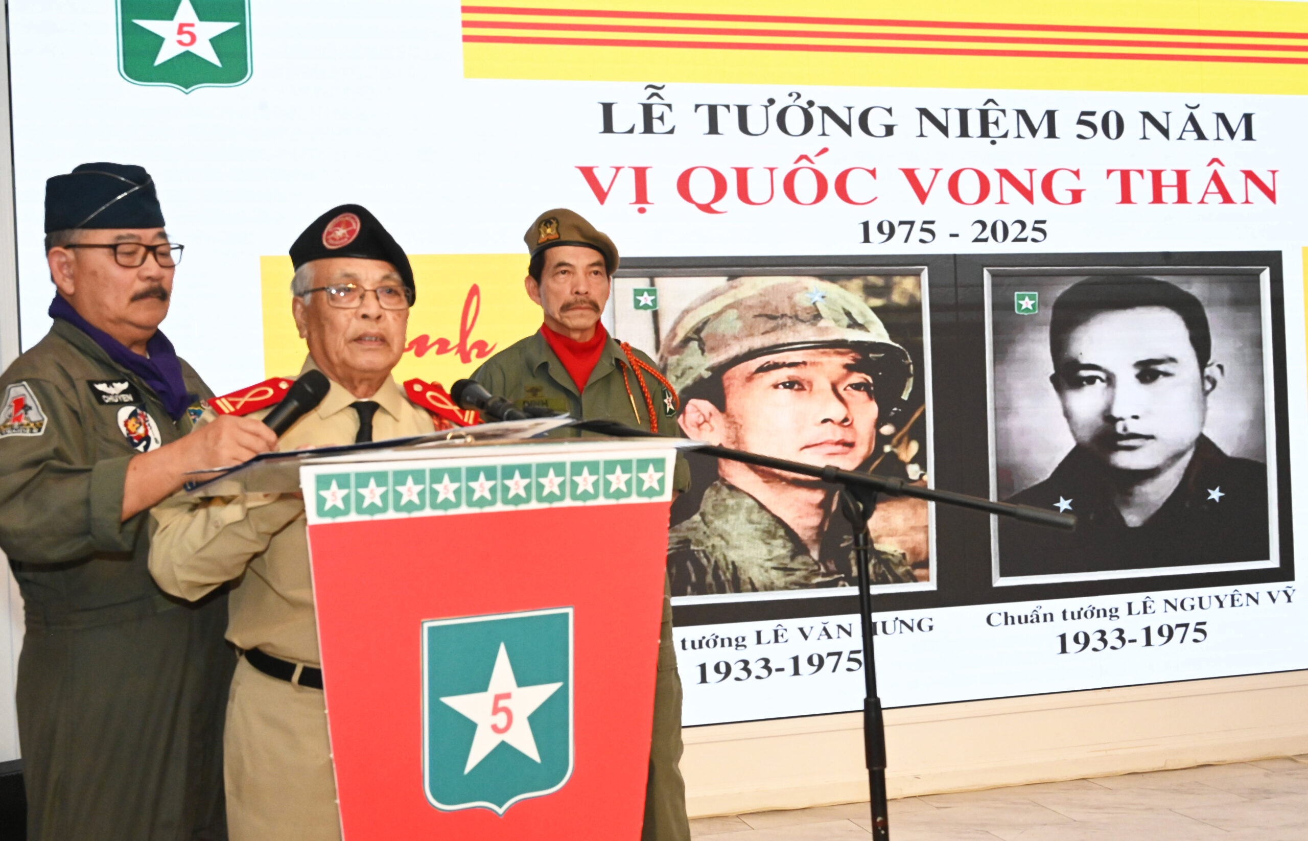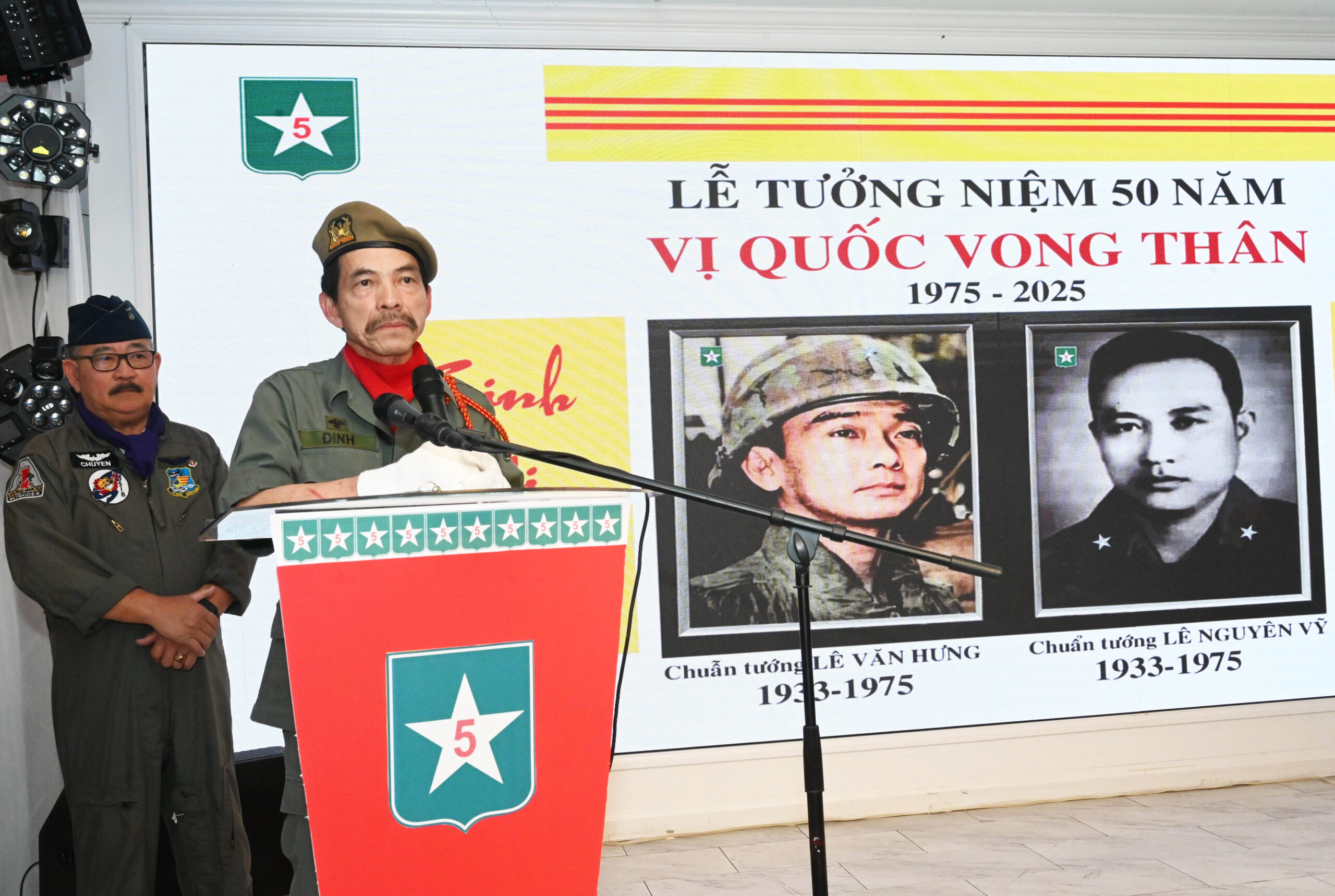 Ông Nguyễn Định, hội trưởng Hội Ái Hữu Sư Đoàn 5 Bộ Binh, chào mừng quan khách nói: “…Cựu quân nhân Sư Đoàn 5 Bộ Binh hôm nay quy tụ về đây trong tinh thần đoàn kết huynh đệ chi binh, cùng với các cựu quân dân cán chính VNCH để tưởng niệm ngày Quốc Hận, tiếp đến là lễ tưởng niệm 50 năm vị quốc vong thân của hai vị cựu tư lệnh đáng kính, Chuẩn Tướng Lê Văn Hưng và Chuẩn Tướng Lê Nguyên Vỹ đã tuẫn tiết hy sinh đền nợ nước để giữ trọn lời thề trên lá hiệu kỳ của sư đoàn, xứng danh ‘Sinh Vi Tướng, Tử Vi Thần.’ Với lòng quyết tâm của sư đoàn vẫn còn đây vì cuộc chiến với kẻ thù vẫn chưa chấm dứt, các cựu quân nhân Quân Lực VNCH chúng ta phải giữ vững tinh thần bất khuất với ‘Bổn Phận-Danh Dự-Trách Nhiệm’ đối với tổ quốc và dân tộc Việt Nam.”