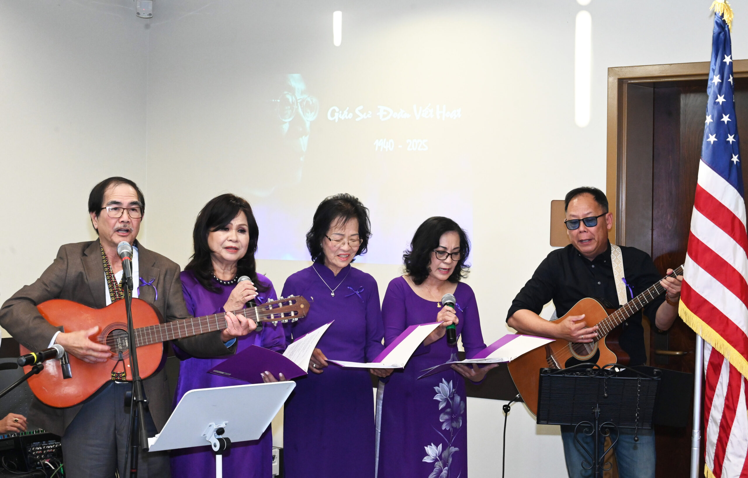 Nhóm thân hữu đồng ca bài “Bài Ca Tuổi Trẻ” trong Lễ Tưởng Niệm Giáo Sư Đoàn Viết Hoạt. (Hình: Văn Lan/Người Việt)
