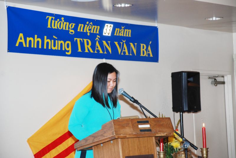 Cô Sarah Hồ, một đại diện sinh viên Việt Nam Nam California, với tiếng Việt thật chuẩn xác, đã đọc bản tiểu sử Trần Văn Bá.