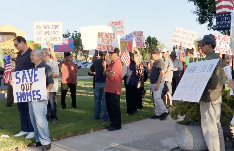 WESTMINSTER, California (NV) – Một số đông cư dân cao niên, phần đông là người Việt sống trong các khu mobile home, rủ nhau lập hội, đòi hỏi giới hạn tiền thuê đất (rent control) và biểu tình, lúc 6 giờ chiều Thứ Tư, 22 Tháng Tám, trước phòng họp Hội Đồng Thành Phố Westminster.