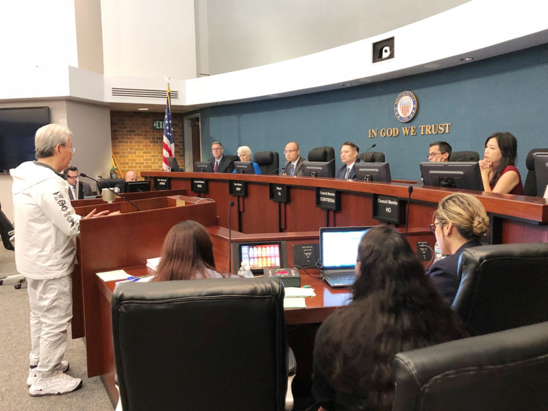Phiên họp thường lệ của hội đồng bắt đầu lúc 7 giờ tối. Tuy vấn đề giới hạn tiền thuê đất không được ghi trong nghị trình, Thị Trưởng Westminster Trí Tạ và các thành viên Hội Đồng Thành Phố hiện diện gồm Phó Thị Trưởng Tyler Diệp và các nghị viên Sergio Contreras, Margie Rice và Kimberly Hồ đều dành thời giờ lắng nghe khoảng mười cư dân cao niên phát biểu.