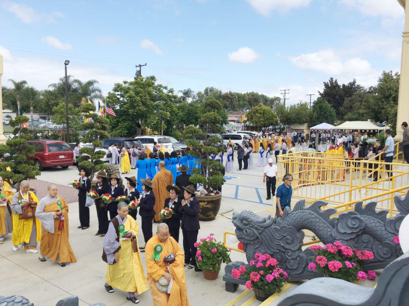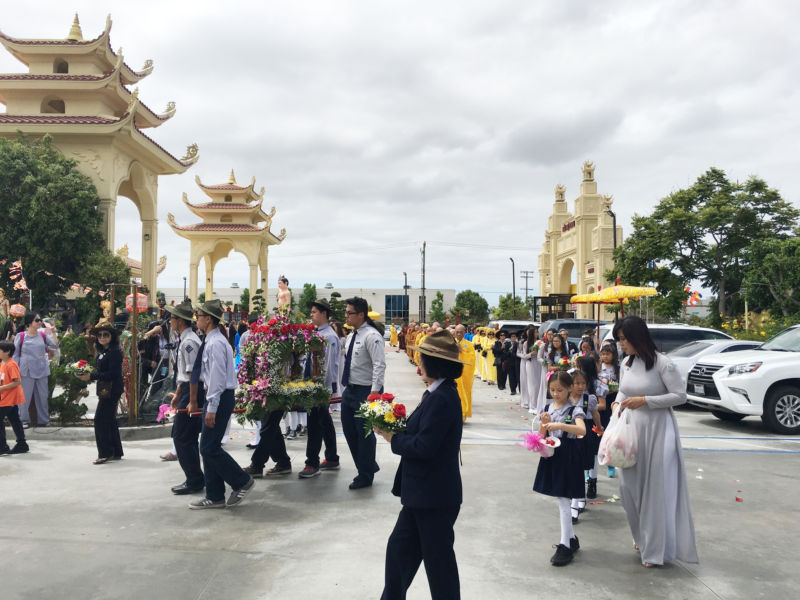 Buổi đại lễ bắt đầu từ lúc 11 giờ nhưng chỉ mới hơn 9 giờ sáng, Phật tử đã đến rất đông. Bãi đậu xe rộng lớn đối diện nhà chùa không còn chỗ trống nên khách phải tìm đậu xe ở những con đường gần đó.