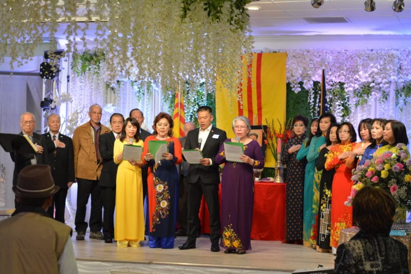 Hội Ái Hữu Gò Công Nam California hát Quốc Ca Hoa Kỳ và VNCH. (Hình: Công Thành/Người Việt)
