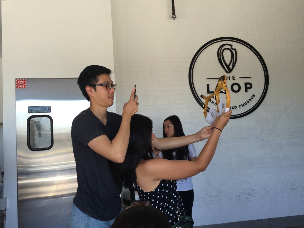 Hình ảnh các bạn trẻ một tay cầm churros, đưa lên đưa xuống để tìm góc hình đẹp nhất rồi lấy điện thoại chụp, sau đó thì “check-in” và đưa lên trang mạng xã hội như Facebook, Snapchat hay Instagram trở nên quá đỗi bình thường tại The Loop.