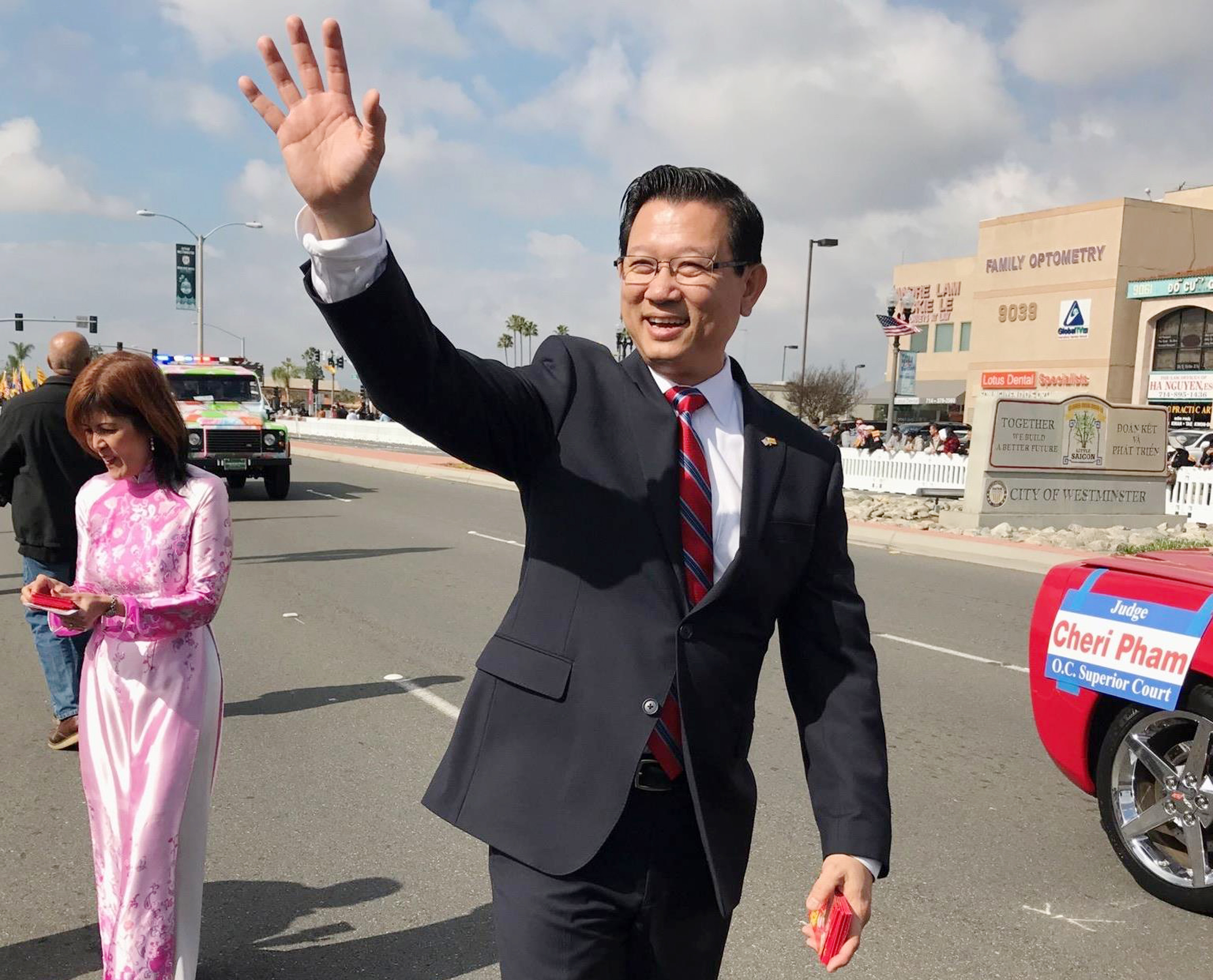 Ông Andrew Đỗ trong một lần tham dự Diễn Hành Tết trên đường Bolsa, Westminster. Phía sau là vợ ông, Chánh Án Cheri Phạm. (Hình: Facebook AndrewDoOC)