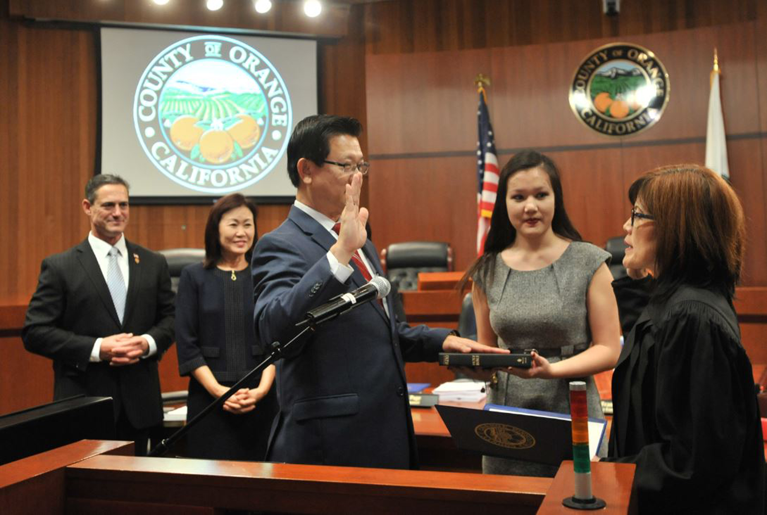 Ông Andrew Đỗ (thứ ba từ trái) tuyên thệ nhậm chức giám sát viên dưới sự chủ tọa của vợ ông, Chánh Án Cheri Phạm, hôm 10 Tháng Giêng, 2017, sau khi tái thắng cử nhiệm kỳ thứ nhì. (Hình: Người Việt)
