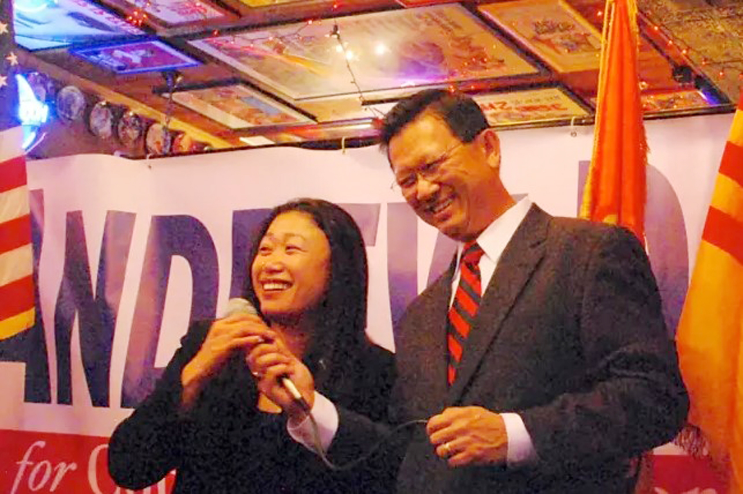 Thượng Nghị Sĩ Janet Nguyễn (trái) chúc mừng ông Andrew Đỗ thắng cử chức giám sát viên Orange County, Địa Hạt 1, hồi Tháng Giêng, 2015. (Hình: Nick Gerda/Voice of OC)