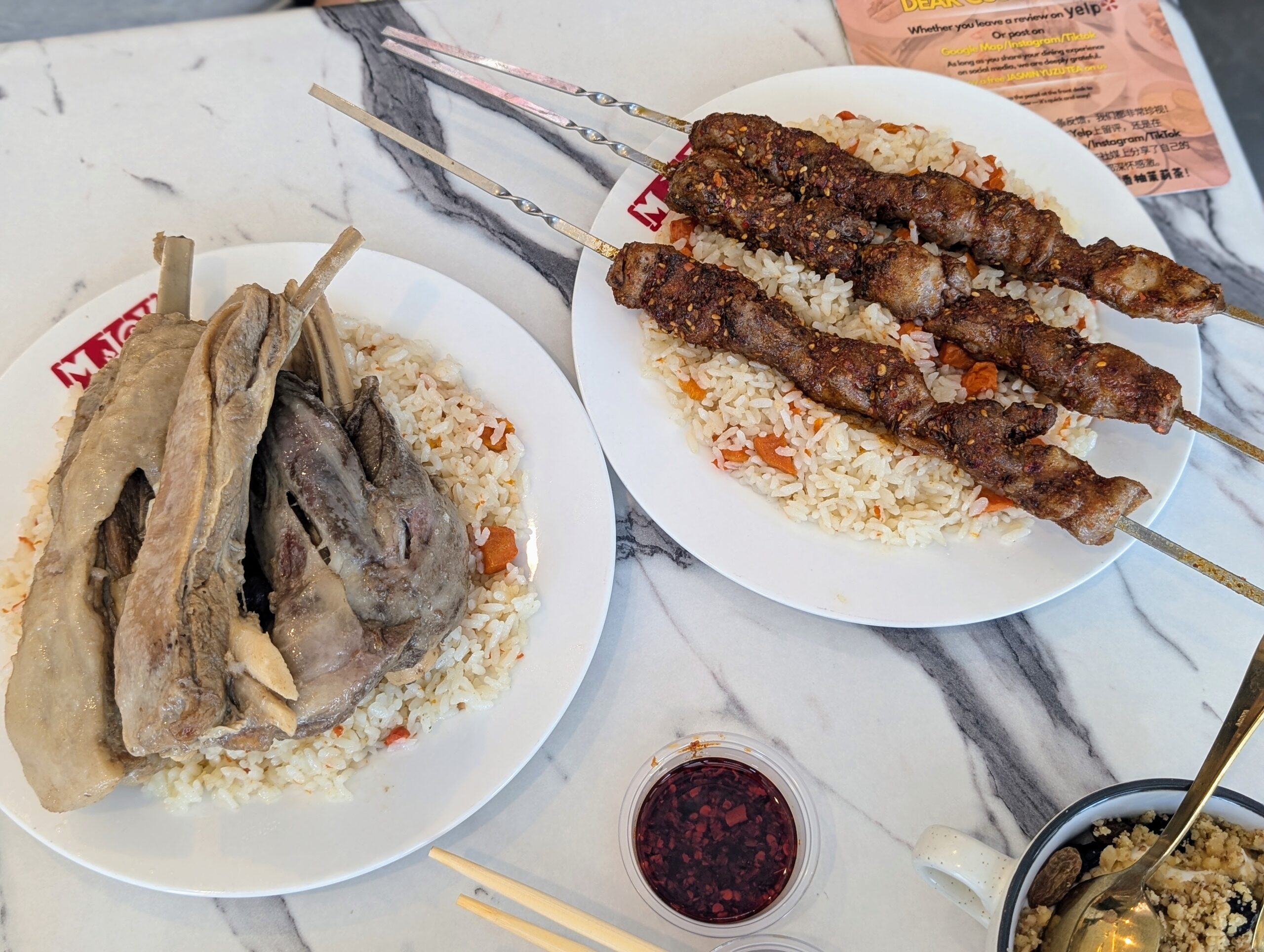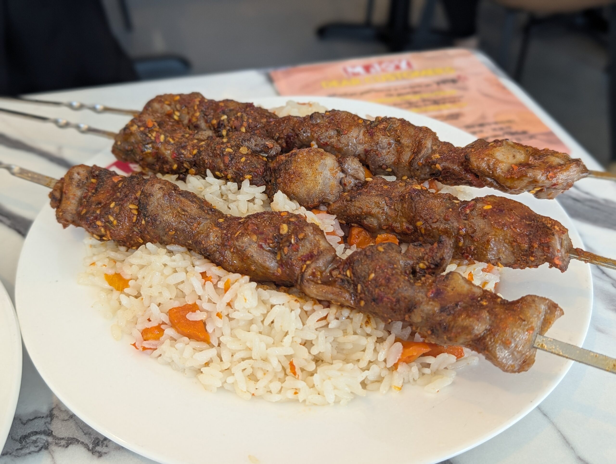 Món cơm với thịt trừu nướng xiên cũng có cơm được nấu bằng nước luộc trừu và có cà rốt, có ba xiên thịt trừu được ướp nhiều gia vị thơm phức ở trên. Những miếng thịt trừu được ướp các gia vị gồm có ớt khô, mè và hạt thì là nên đầy mùi thơm, có mùi hơi khét và có vị mặn ngọt vừa phải thấm vào từng miếng thịt trừu nạc hơi dai và thơm béo. Những gia vị đó còn thấm vào cơm, làm từng hạt cơm có thêm vị cay rất ngon.