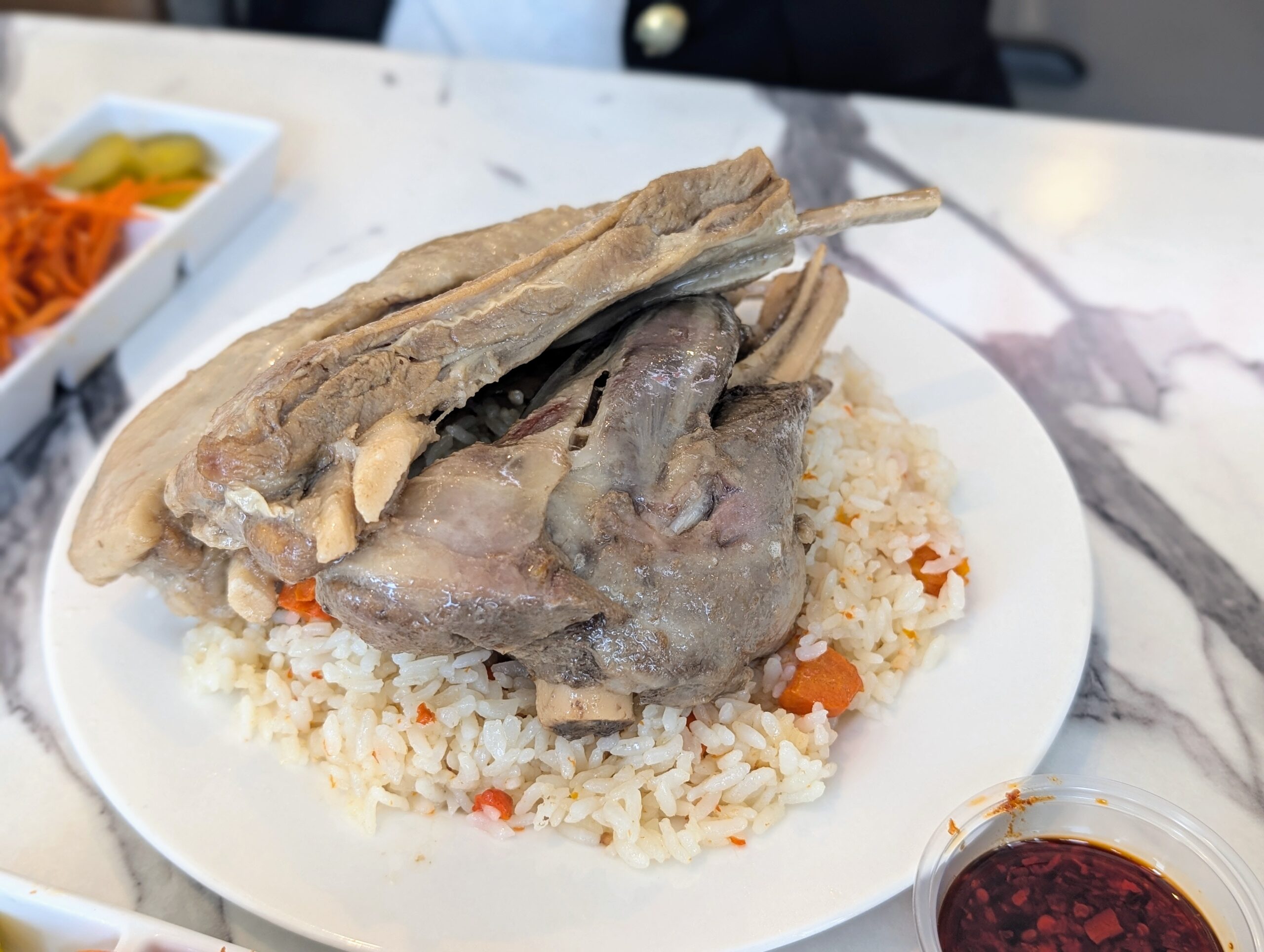 Phần cơm có một miếng thịt bắp đùi trừu và một miếng sườn được luộc mềm mại, nằm trên lớp cơm được nấu bằng nước luộc trừu và nấu chung với cà rốt. Thịt bắp trừu mềm mại, chỉ cần lấy muỗng xắn nhẹ là rời khỏi xương ngay, vì chỉ luộc nên đầy vị ngọt tự nhiên của trừu.