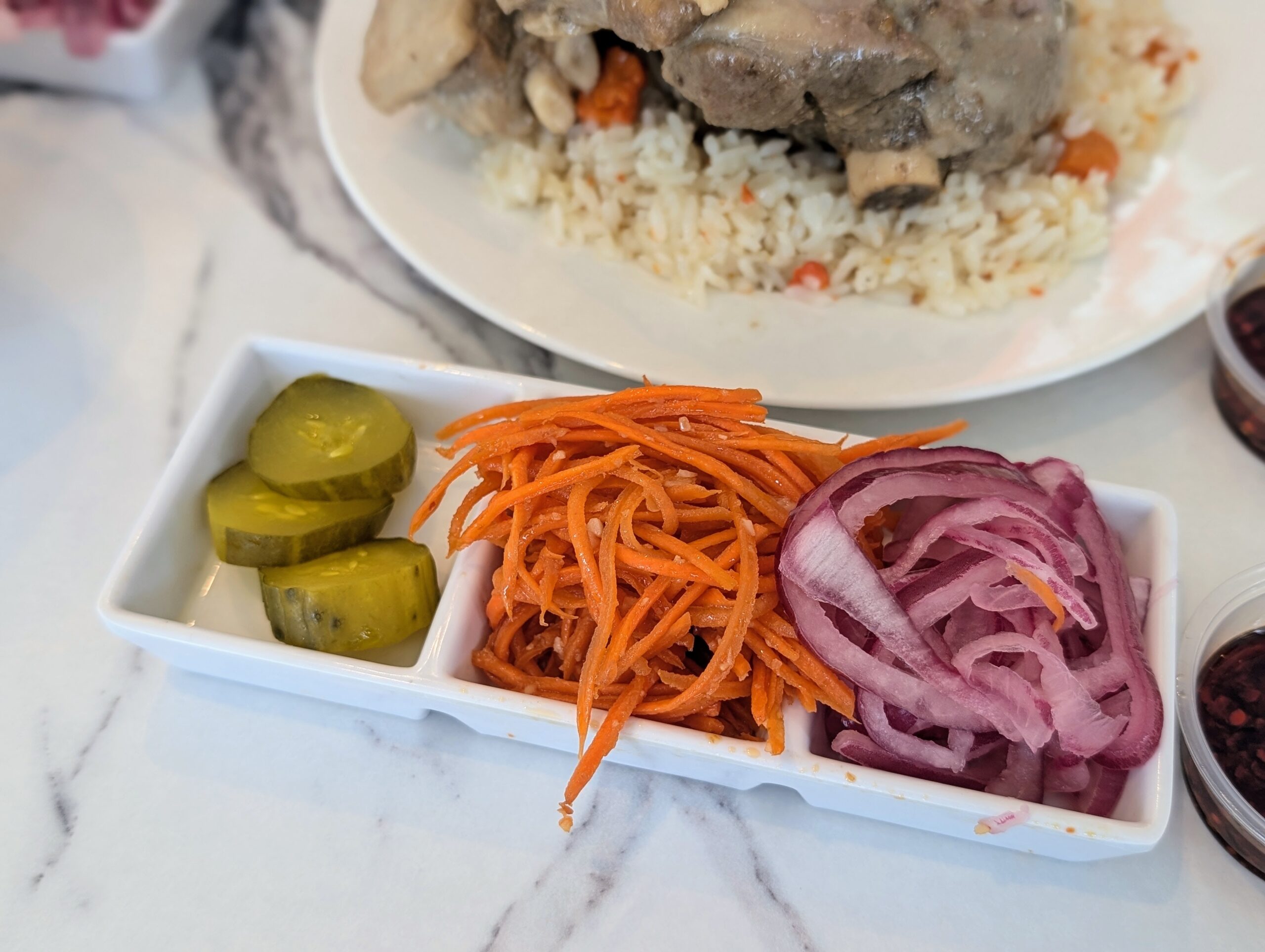 Dưa chua giòn nhẹ, đầy vị chua của giấm và có chút mùi thơm của thì là. Cà rốt được xắt sợi trộn với dầu mè, giấm và tỏi, có vị chua ngọt kết hợp với vị thơm nồng của tỏi. Hành chua thì chỉ có hành tím được ngâm giấm, nên đầy vị ngọt của hành với vị chua của giấm. Những món ăn kèm này giúp tẩy vị béo của trừu để thực khách không ngán nên là một phần không thể thiếu của bữa ăn.
