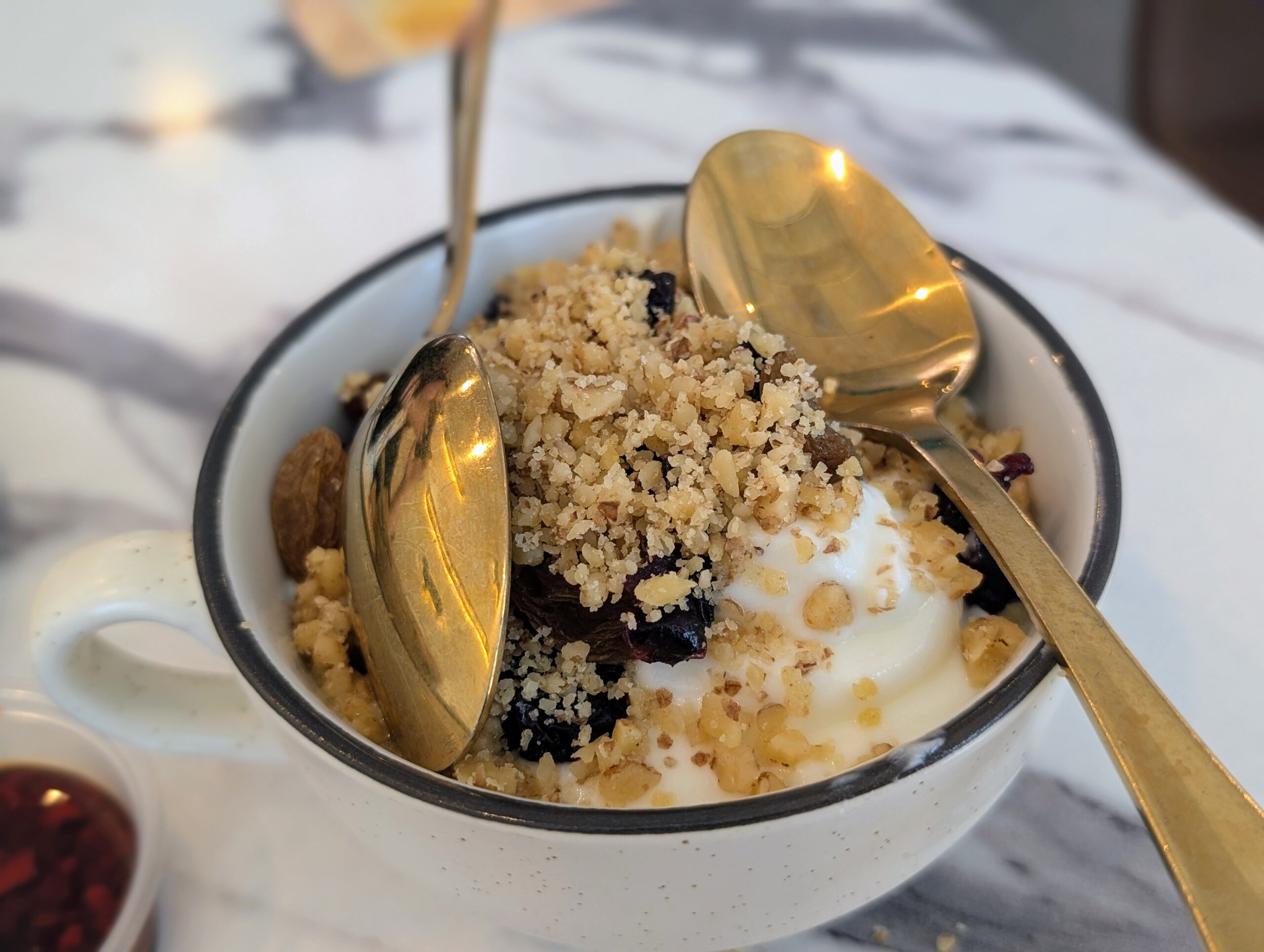 Cuối cùng là phần sữa chua tự làm của M Joy, có sữa chua ăn chung với đậu phộng và nho khô. Sữa chua mịn màng, có vị ngọt rất nhẹ và không quá chua. Những hạt đậu phộng mang độ giòn cho món tráng miệng này, còn những trái nho khô thì mang vị ngọt đậm đà.