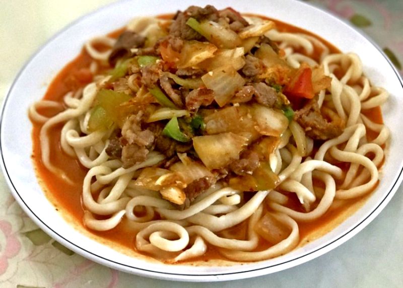 Ăn hết mấy xâu trừu thì đĩa mì kéo tay có mặt trên bàn. Chưa ngon miệng thì đã ngon mắt rồi, vì đĩa mì có rất nhiều màu sắc. Nào là màu trắng của mì, màu đỏ của cà chua và ớt, thêm màu xanh của bắp cải và màu nâu đỏ của nước sốt, rồi thêm tí thịt bò nữa. Nhìn thèm không chịu được.