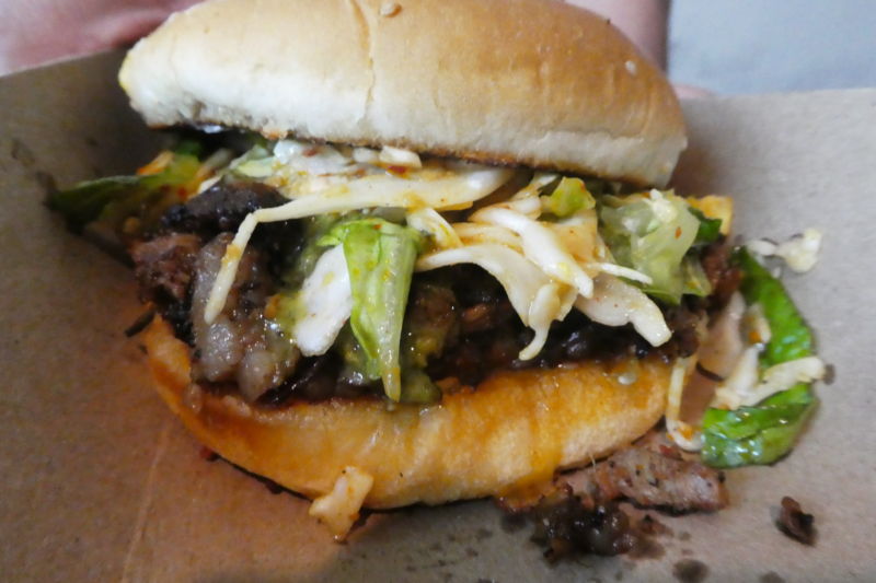 Như đã nói, đây là một xe bán các món fusion Mễ-Hàn và Kogi bán các món ăn Mễ như taco, burrito nhưng nhân bên trong là của Đại Hàn. Lần đầu không biết ăn gì nên tôi hỏi ông khách hồi nãy, ông nói nên thử các loại taco, rồi thử quesadilla và “Pacman Burger.”