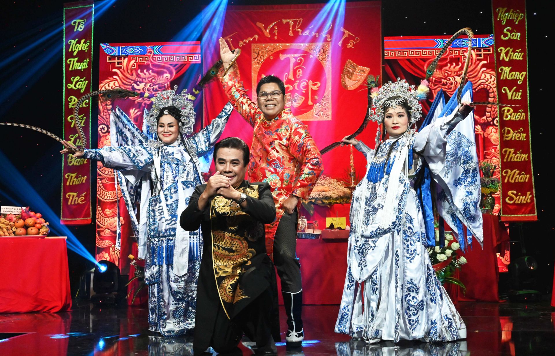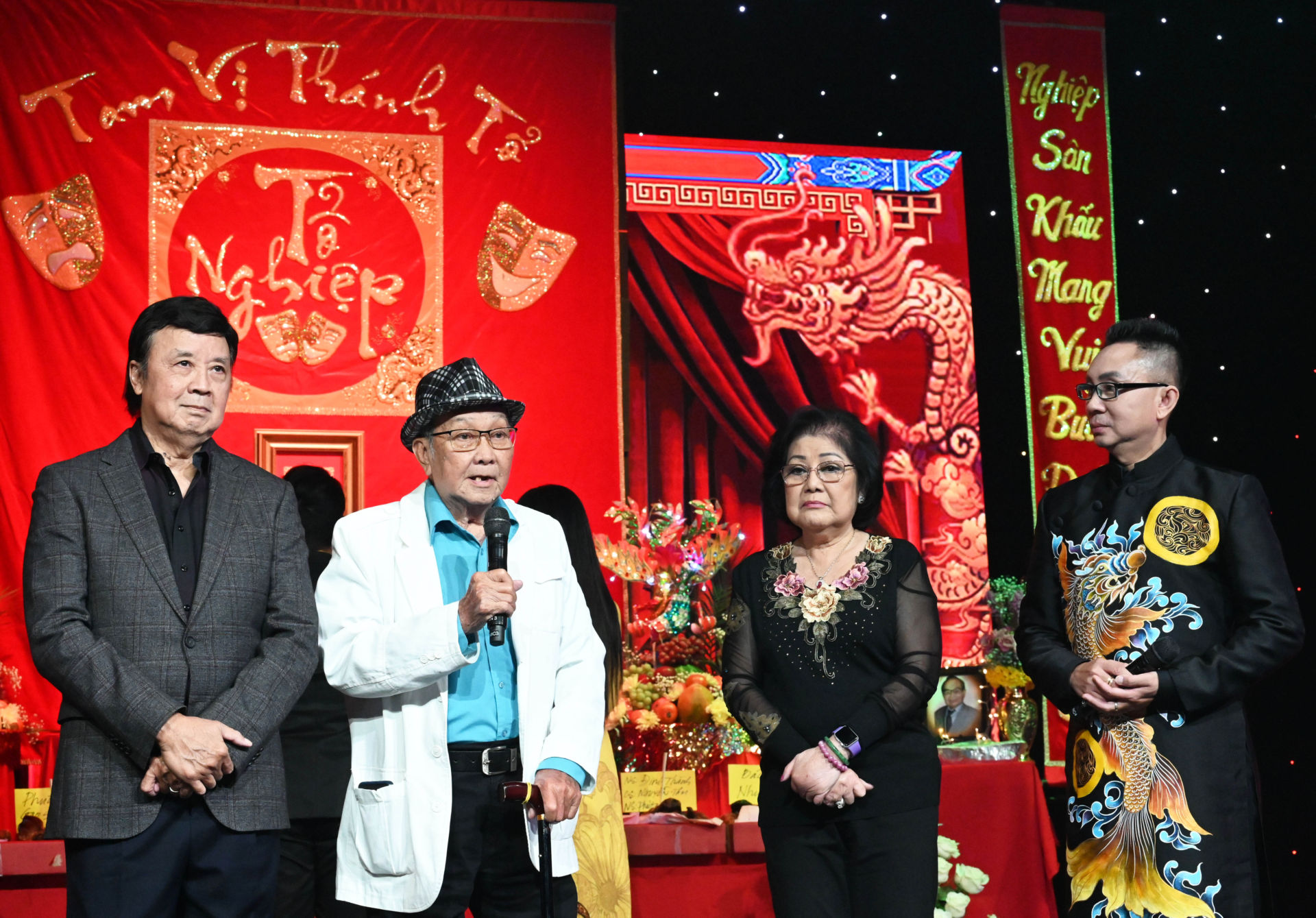 Từ trái, nghệ sĩ Bảo Quốc, Hương Huyền, Phượng Liên, và MC Thanh Tùng dâng lời tri ân Tổ Nghiệp, các bậc tiền bối, và khán giả trong lễ Giỗ Tổ. (Hình: Văn Lan/Người Việt)