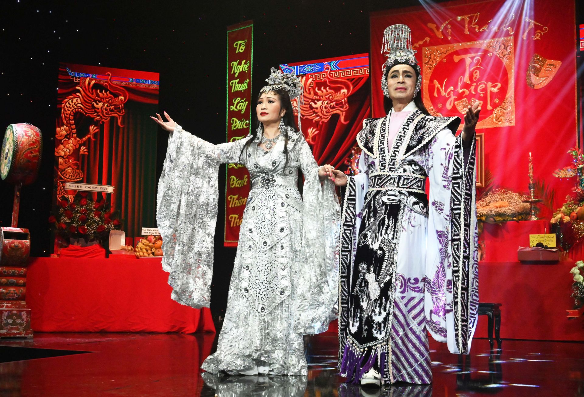 Hai nghệ sĩ Phương Hồng Thủy (trái) và Đinh Thành hát bài vọng cổ “Hiếu Đạo” gây nhiều cảm xúc cho khán giả. (Hình: Văn Lan/Người Việt)