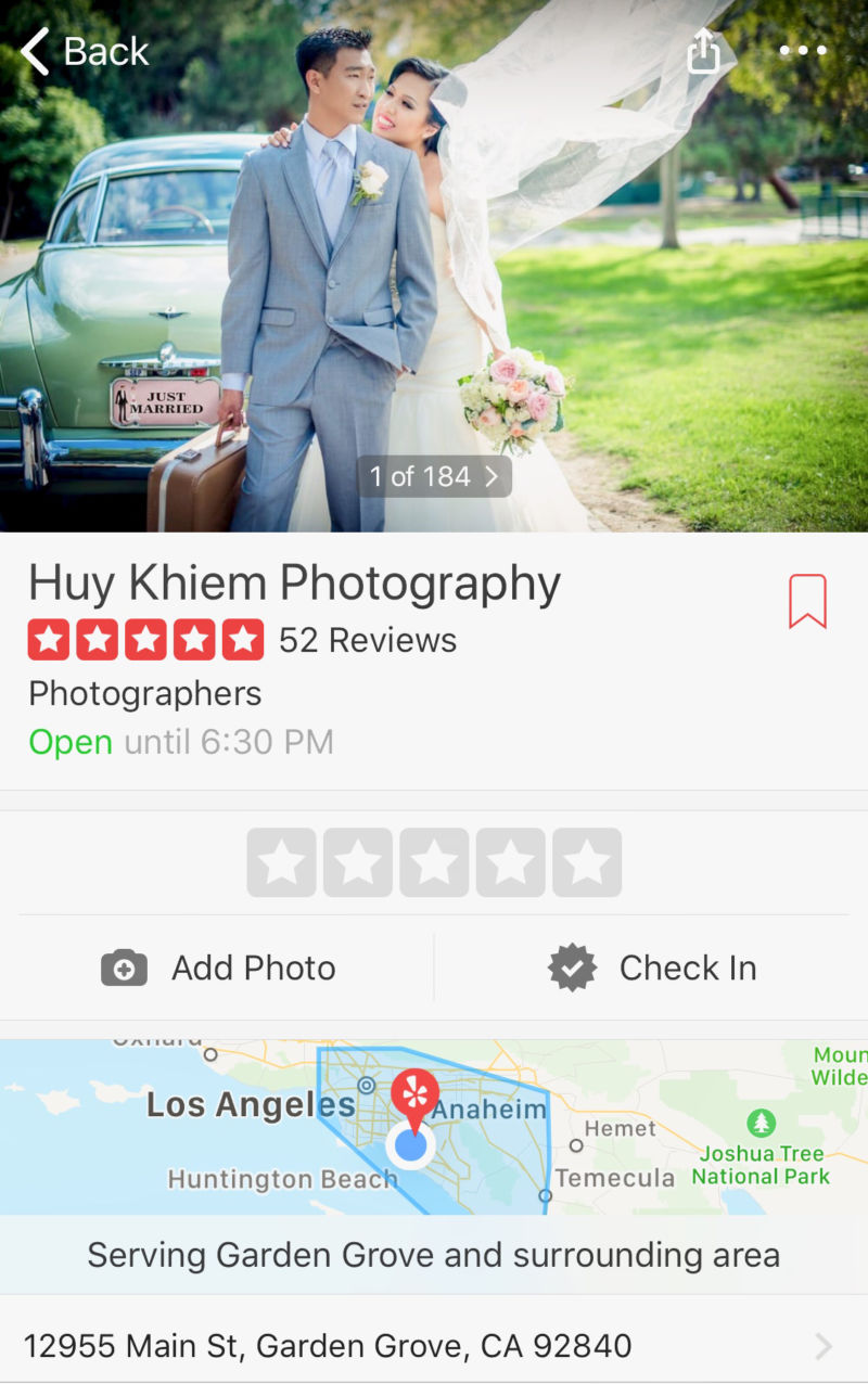 Nhiếp ảnh gia Huy Khiêm, chủ nhân Huy Khiêm Photography ở thành phố Garden Grove, studio có “5 sao” trên Yelp, nói rằng thực sự rất cảm ơn người sáng tạo ra Yelp bởi giúp ích rất nhiều cho công việc của anh.