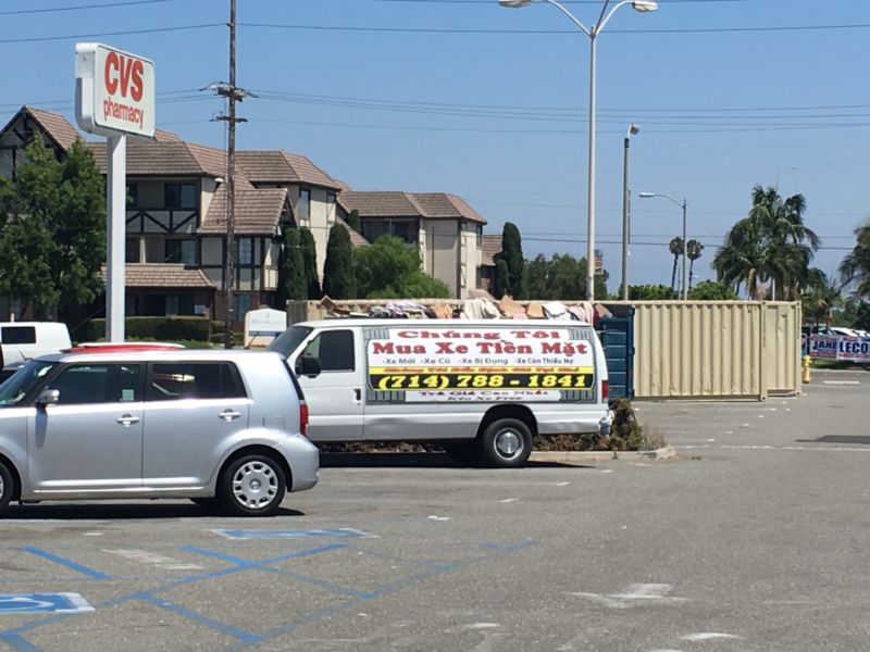 “Mua xe cũ, xe bị đụng, xe còn thiếu nợ” cũng là một nghề kiếm tiền của người Việt tại Little Saigon. (Hình: Trúc Linh/Người Việt)