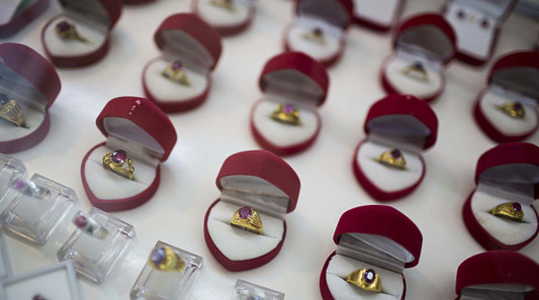 Nhẫn đá ruby bày bán tại một tiệm đá quí ở Mandalay, Myanmar, quốc gia cung cấp 90% đá ruby trên thế giới. (Hình: Getty Images/Taylor Weidman)