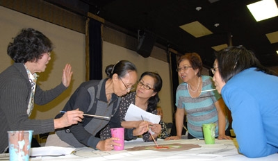 Lớp vẽ cho người cao niên do họa sĩ Trịnh Mai hướng dẫn, do viện bảo tàng Bowers và nhật báo Người Việt tổ chức. (Hình: Linh Nguyễn/Người Việt)