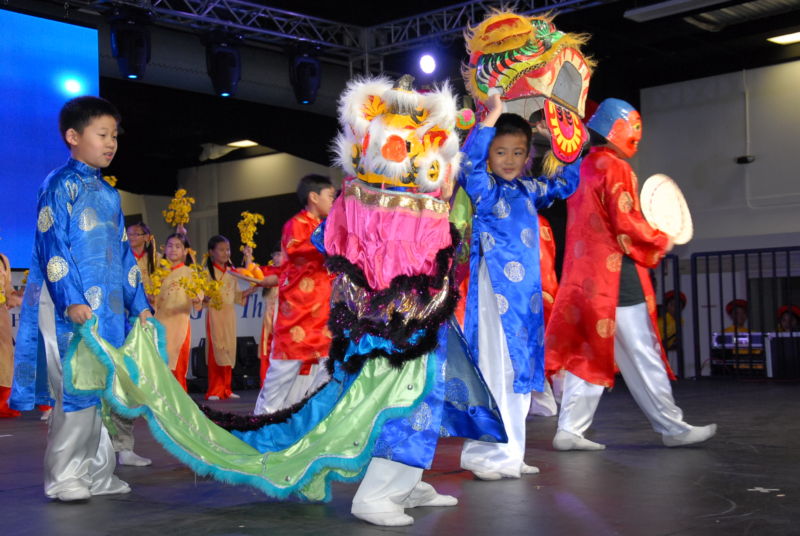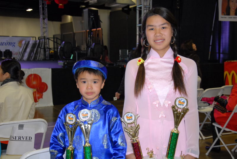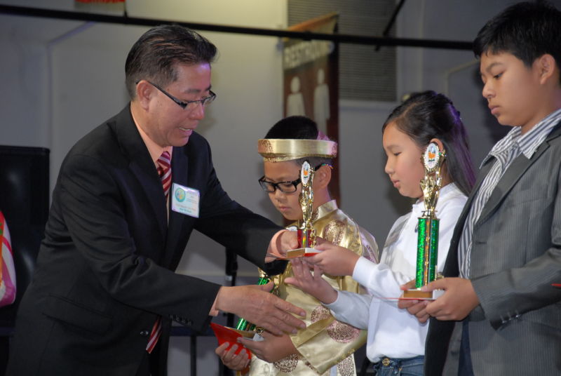 Thầy Nguyễn Văn Khoa (trái), thay mặt Ban Đại Diện Các TTVN Nam California, trao giải thưởng thi chính tả tại Hội Chợ Tết Sinh Viên năm Giáp Ngọ, Costa Mesa, California.
