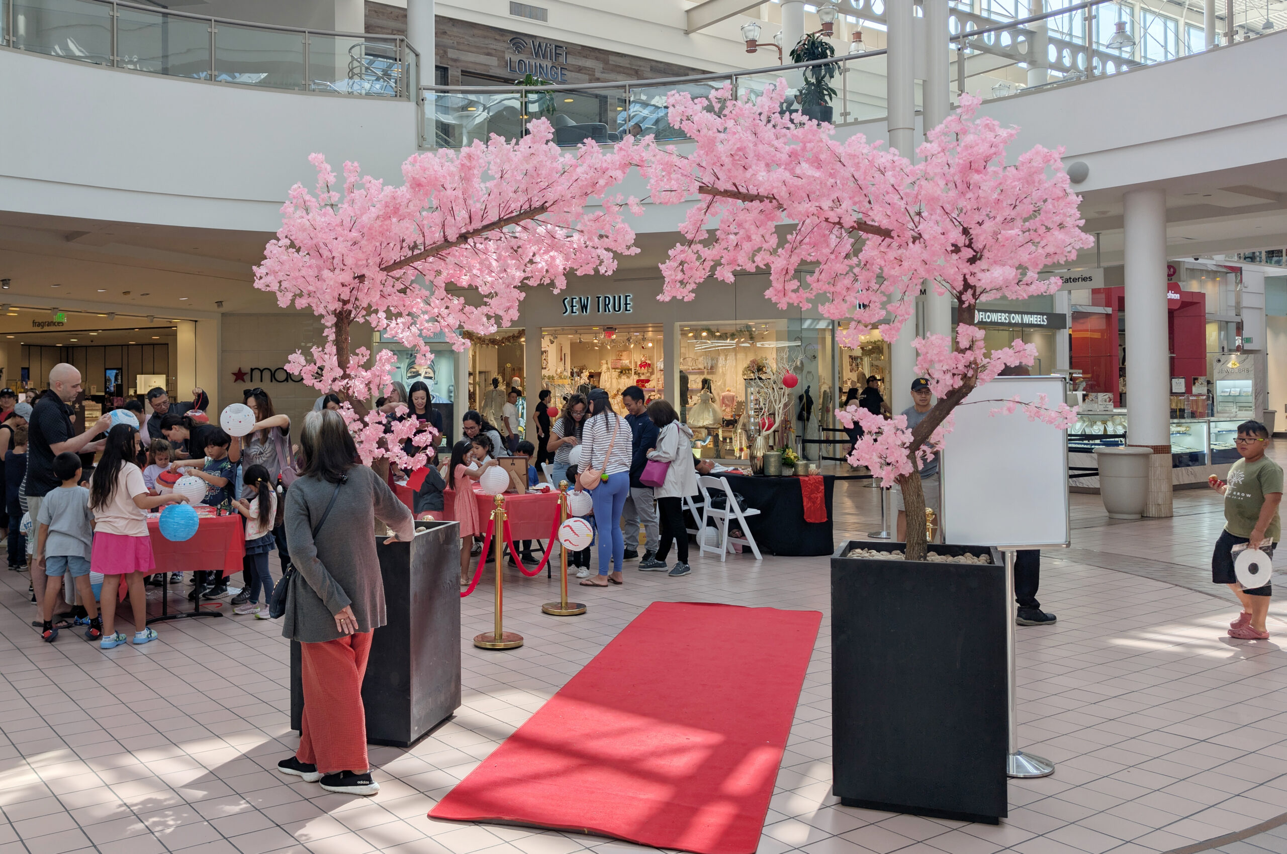 Lễ hội Trung Thu nhỏ của Mainplace Mall được tổ chức tại sảnh ngay trước cửa hàng Macy’s, có nhiều phụ huynh dắt con cái đến tham dự các chương trình vui tươi. Mainplace Mall là khu mua sắm quen thuộc với cư dân Orange County, nên thu hút nhiều sắc dân đến.