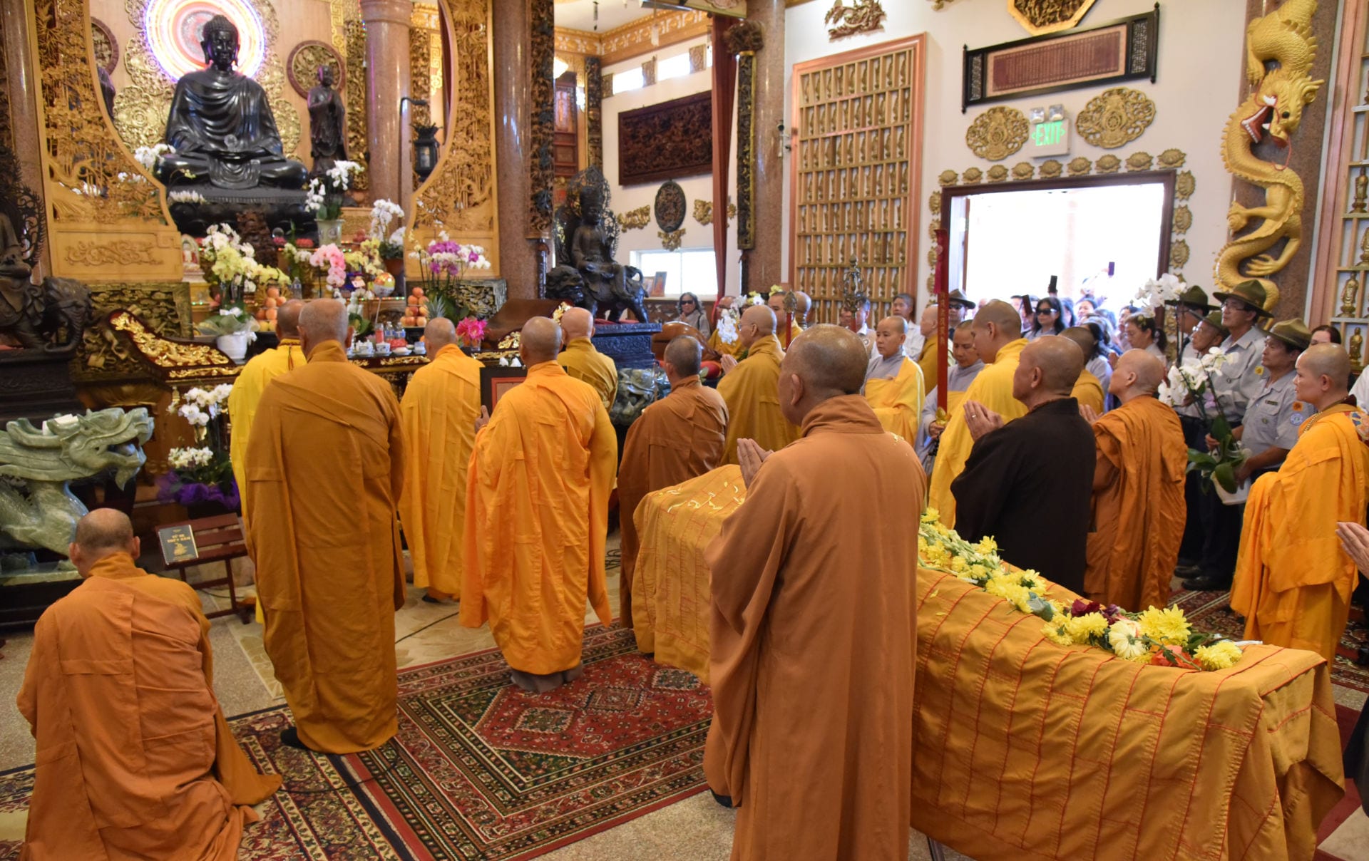 SANTA ANA, California (NV) – Sau khi viên tịch lúc 0 giờ 45 phút sáng sớm Chủ Nhật, 9 Tháng Sáu, vào lúc 11 giờ sáng cùng ngày, nhục thân của cố Hòa Thượng Thích Quảng Thanh được chuyển đến chánh điện chùa Bảo Quang, Santa Ana, trước khi đưa đến nhà quàn Peek Family ở Westminster, chờ an táng trong những ngày tới.
