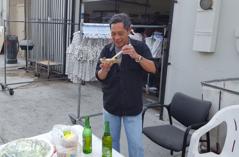 Ngay phía sau một “shop may” vùng Westminster, ông Lê Quốc Tống và ông Nguyễn Văn Hùng chuẩn bị các món ăn “pha trộn” cho cả “shop.”