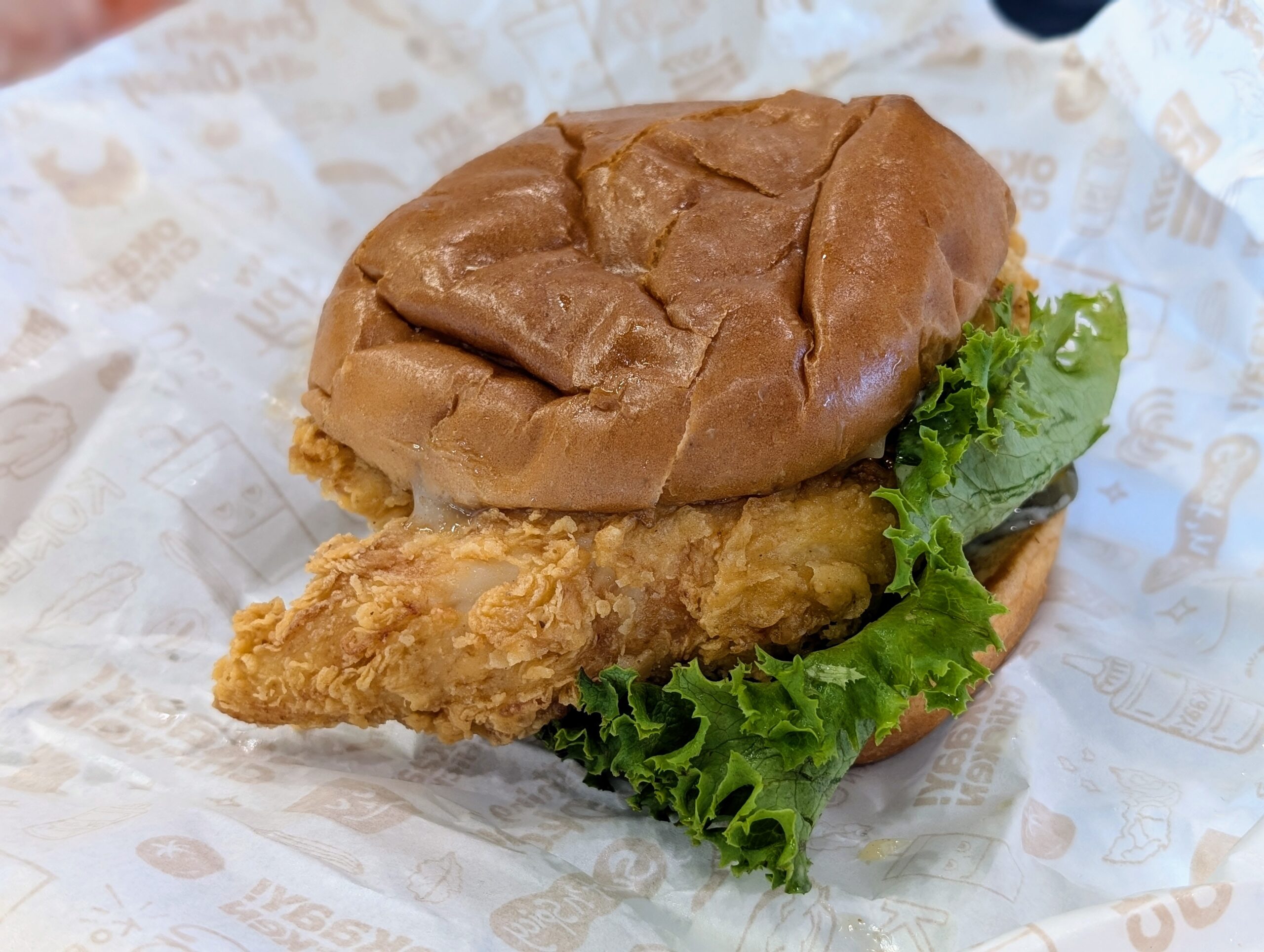 Cuối cùng là bánh mì kẹp gà chiên, có miếng ức gà chiên với rau xà lách, dưa chua và nước xốt mayonnaise. Thực khách còn có thể chọn mùi vị cho miếng gà, và tôi chọn nước xốt cay. Bánh mì mềm xốp, còn miếng gà thì thơm giòn và thấm nước xốt cay thơm với ngọt nhẹ rất ngon.