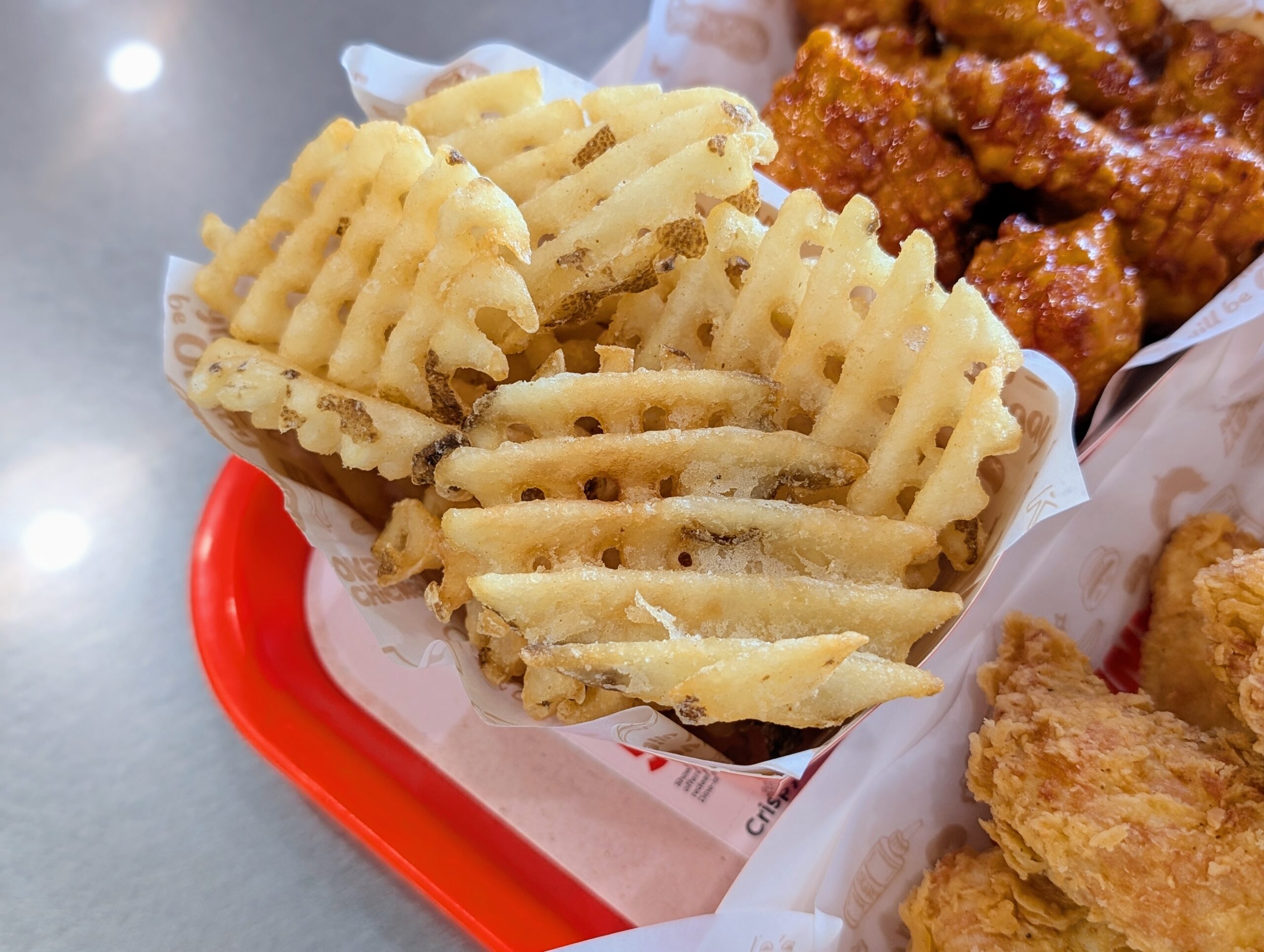 Tôi thử các món khai vị và món ăn kèm trước khi ăn gà. Đầu tiên là khoai tây chiên waffle. Những miếng khoai tây được cắt thành hình lưới như những miếng bánh waffle nhỏ rồi chiên giòn nhìn rất ngon.