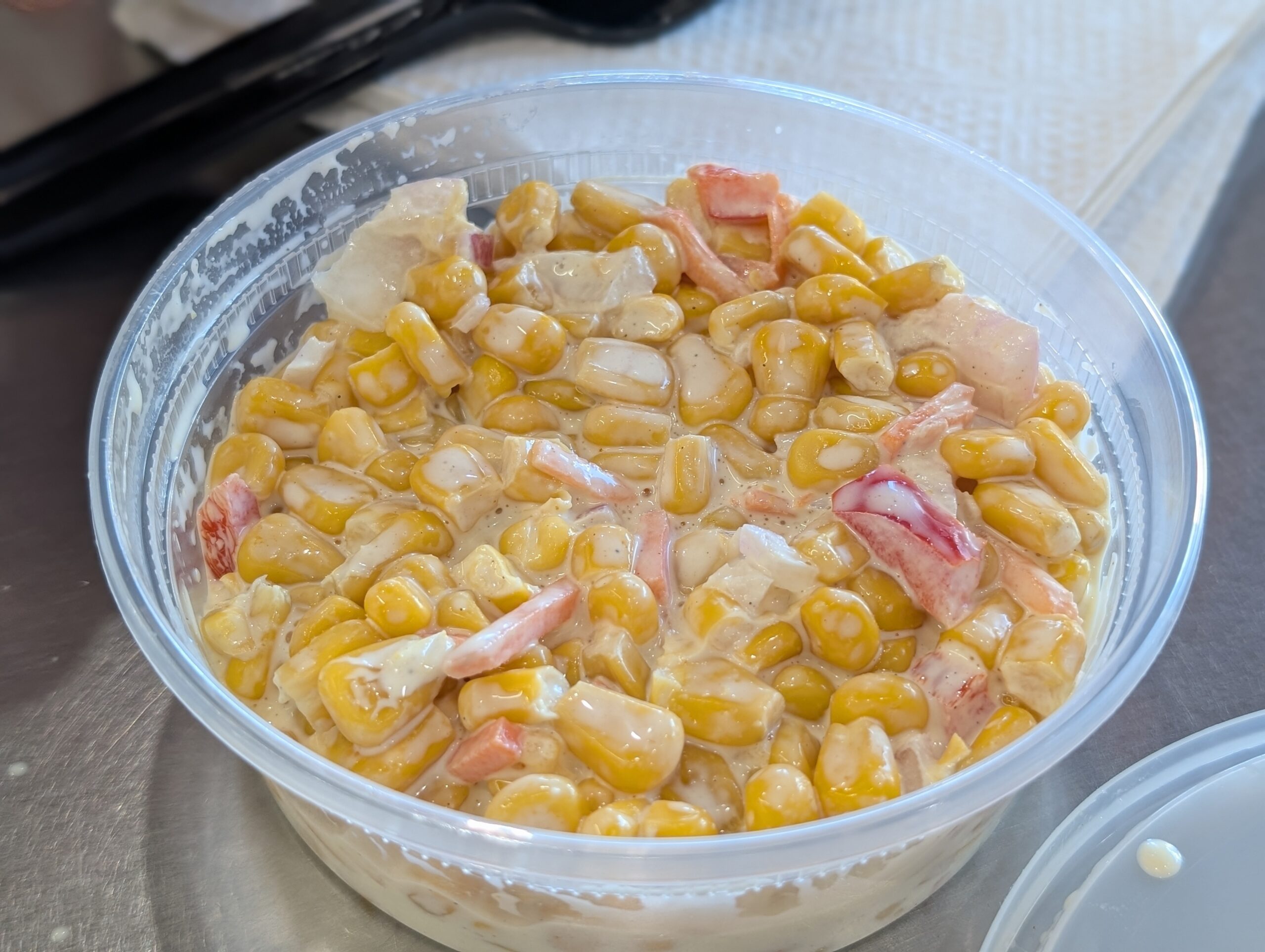 Món xà lách bắp có bắp trộn với nước xốt mayonnaise, hành tây, cà rốt và ớt chuông đỏ. Món ăn này đầy vị ngọt tự nhiên và độ giòn của các loại rau củ, kết hợp với vị béo và hơi chua của mayonnaise rất vừa miệng. Vì là món ăn nguội với nhiều loại rau củ giúp tẩy vị béo, nên xà lách bắp này chắc chắn ăn hợp với các loại gà chiên.