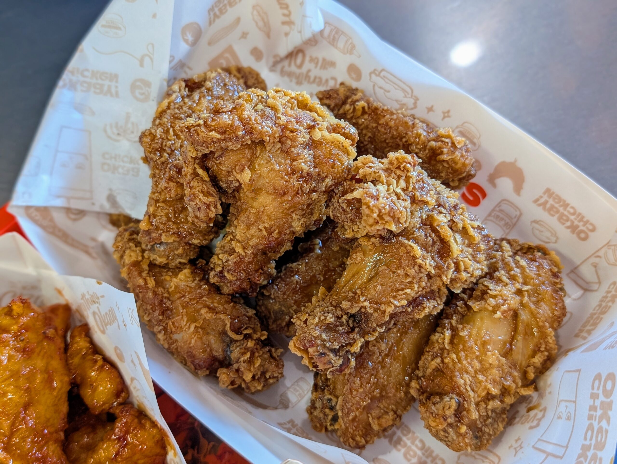 Cánh gà thường thì tôi chọn mùi xì dầu và mật ong, và Okaay! Chicken and Sandwich tự hào nói là họ sử dụng mật ong thật cho món gà này. Tôi đã thấy một số tiệm gà sử dụng nước đường có mùi mật ong, nên an tâm khi thấy tiệm tự hào về việc dùng mật ong thật. Miếng cánh gà nào cũng thơm giòn, không khô chút nào, thấm nước xốt có vị mặn nhẹ và mùi vị ngọt ngào của mật ong, ăn một miếng chỉ muốn ăn thêm.