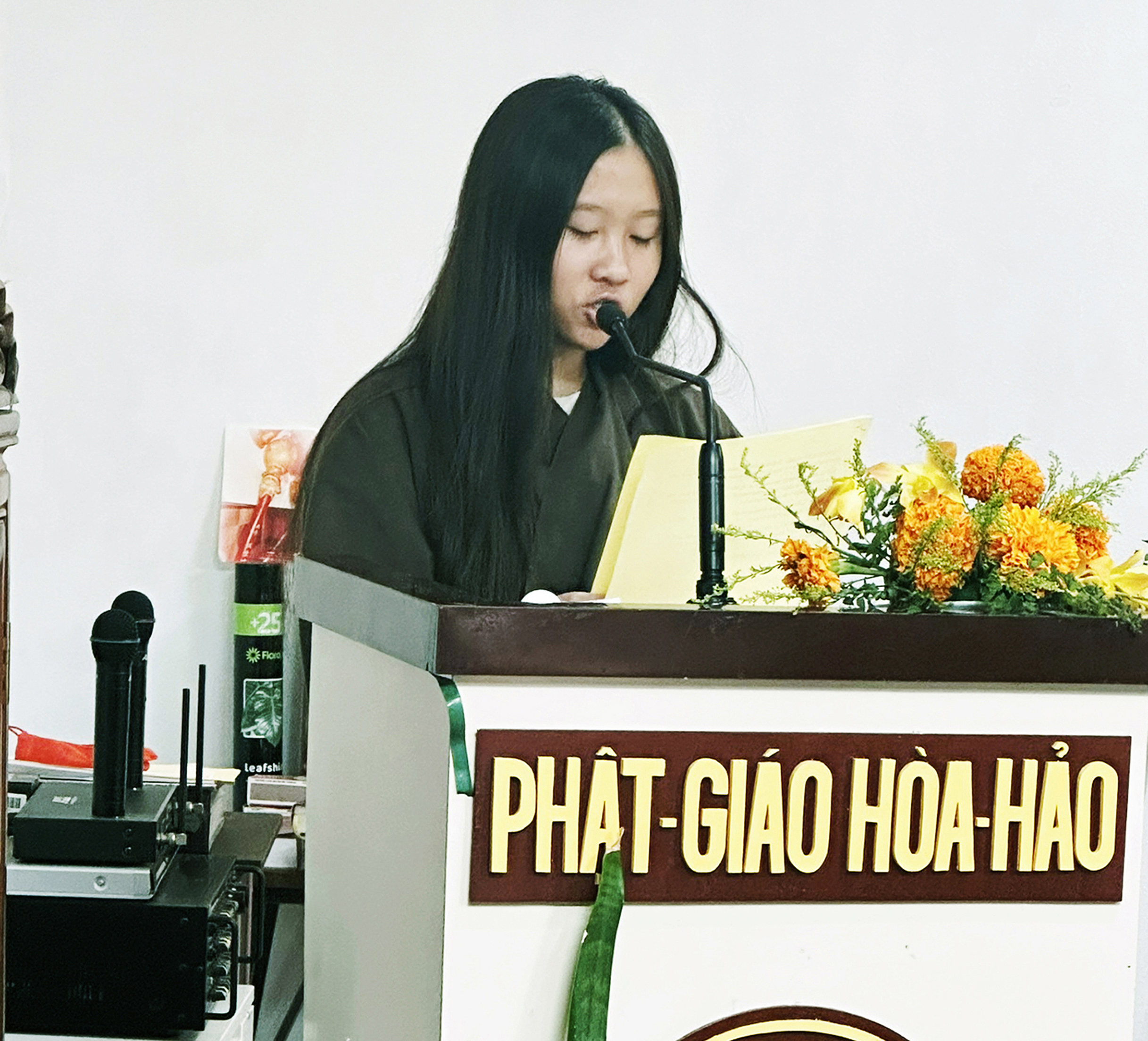 Cô Phan Bảo Thi, đại diện Giới Trẻ PGHH Hải Ngoại, nói: “Trong thời gian gần đây, con thường theo mẹ đến sinh hoạt tại Hội Quán PGHH, và đã học được nhiều điều hay trong giáo lý của Đức Thầy. Nhân Mùa Vu Lan Báo Hiếu, con được mẹ nhắc nhở với con rằng, ‘Công cha như núi Thái Sơn/Nghĩa mẹ như nước trong nguồn chảy ra/Một lòng thờ mẹ kính cha/Cho tròn chữ hiếu mới là đạo con.”