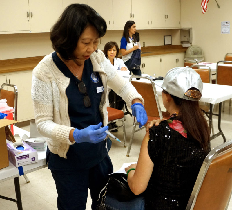Cô Mai Trần, đại diện Trung Tâm Y Tế Nhân Hòa, cho biết: “Chúng tôi đến để chích ngừa cúm cho đồng hương. Khi mùa lạnh đến, vi trùng cúm có cơ hội để xâm nhập vào cơ thể của con người, thành ra chích ngừa cúm là yếu tố rất quan trọng trong thời tiết này. Và chúng tôi đã chuẩn bị trên 1,000 phần thuốc chích ngừa cho đồng hương trong ngày hôm nay.”