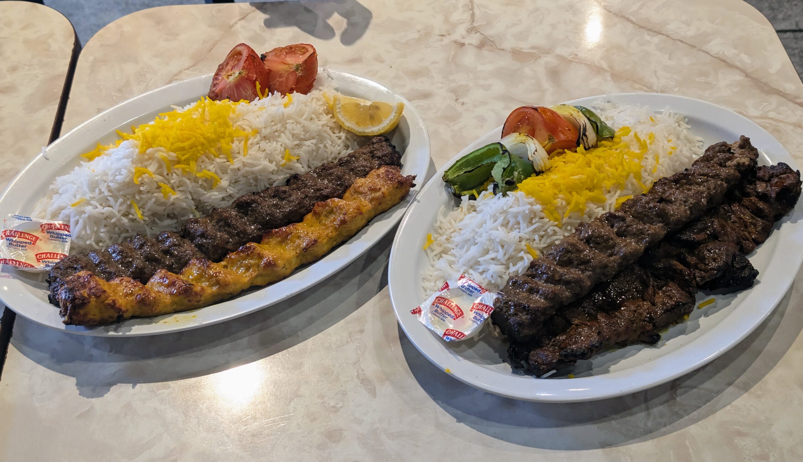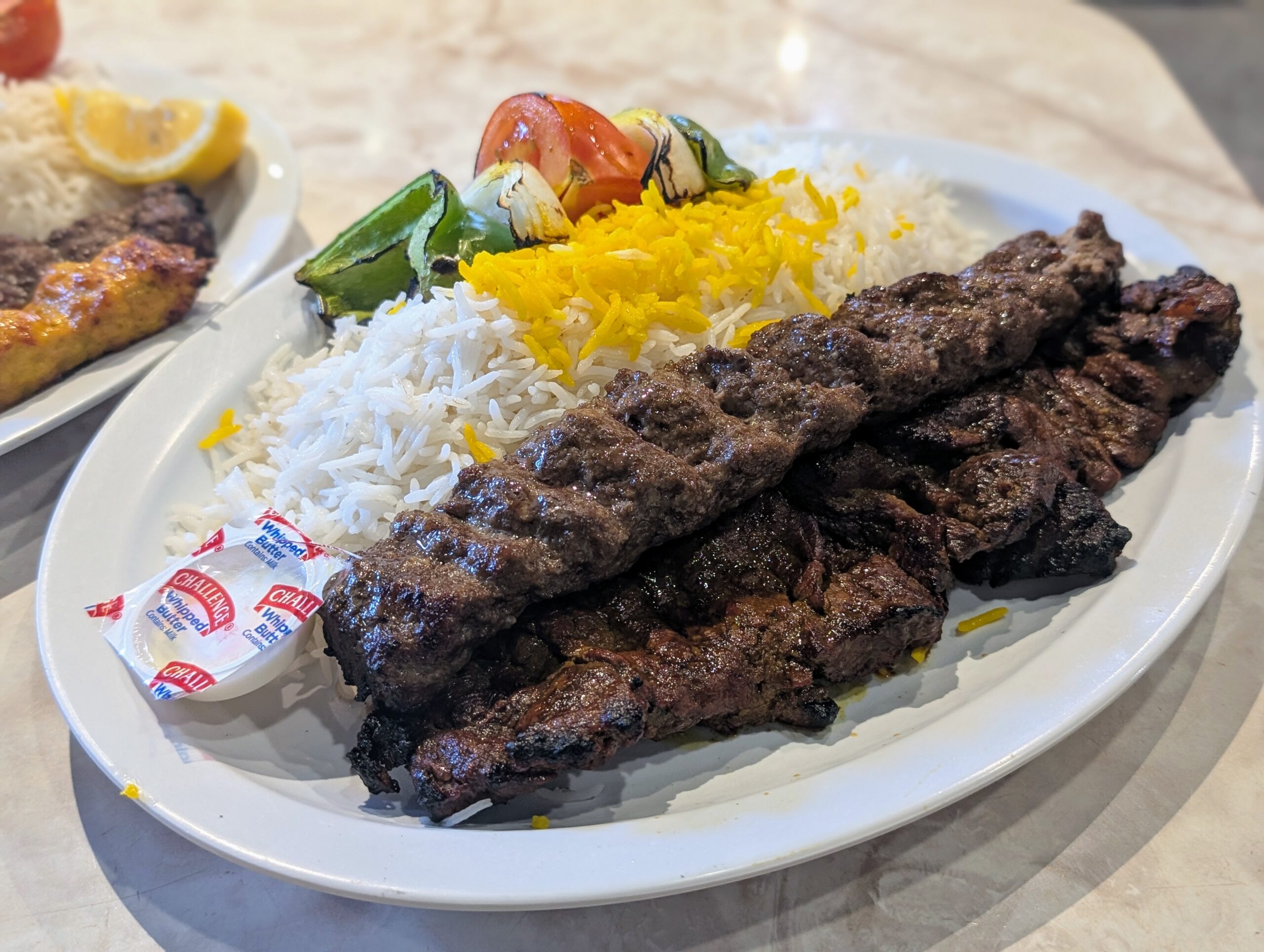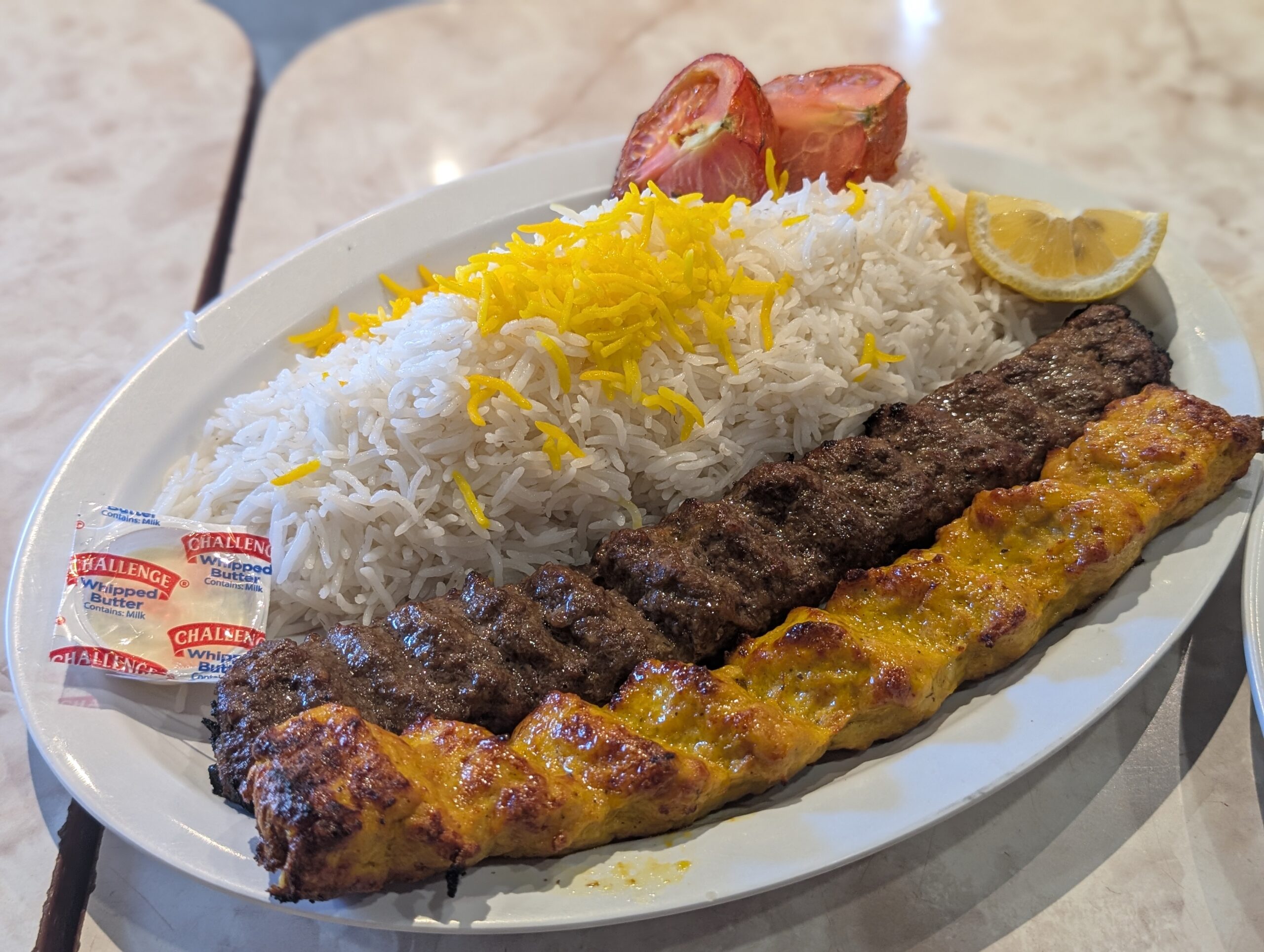 Món chính đầu tiên là cơm với xiên thịt gà bằm và xiên thịt bò bằm nướng, ăn kèm với cơm trắng được trộn một chút cơm nấu với nhụy hoa nghệ tây, còn gọi là saffron, còn có thêm chút bơ để trộn vào cơm và một trái cà chua nướng.
