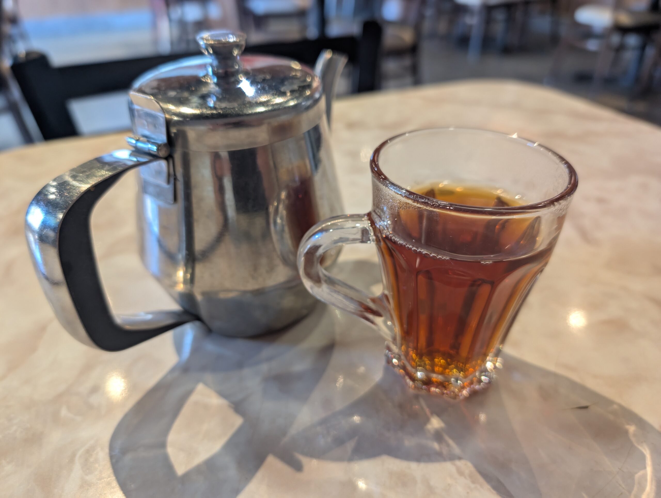 Sau khi gọi món ăn, nhân viên của tiệm hỏi tôi có muốn uống trà không, và mang ra một bình trà miễn phí. Đây là loại trà quen thuộc của Trung Đông, có trà đen được pha với bạc hà, tuy đơn giản nhưng uống rất sảng khoái vì có vị đắng với chút vị chát của trà đen hòa quyện với mùi thơm và vị cay nhẹ của bạc hà. Trà này chắc chắn rất hợp để tẩy miệng khi ăn các loại thịt nướng có mỡ.
