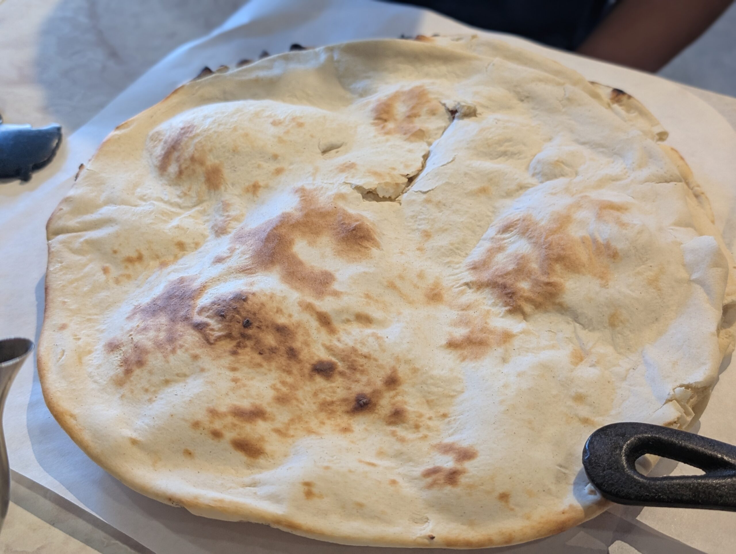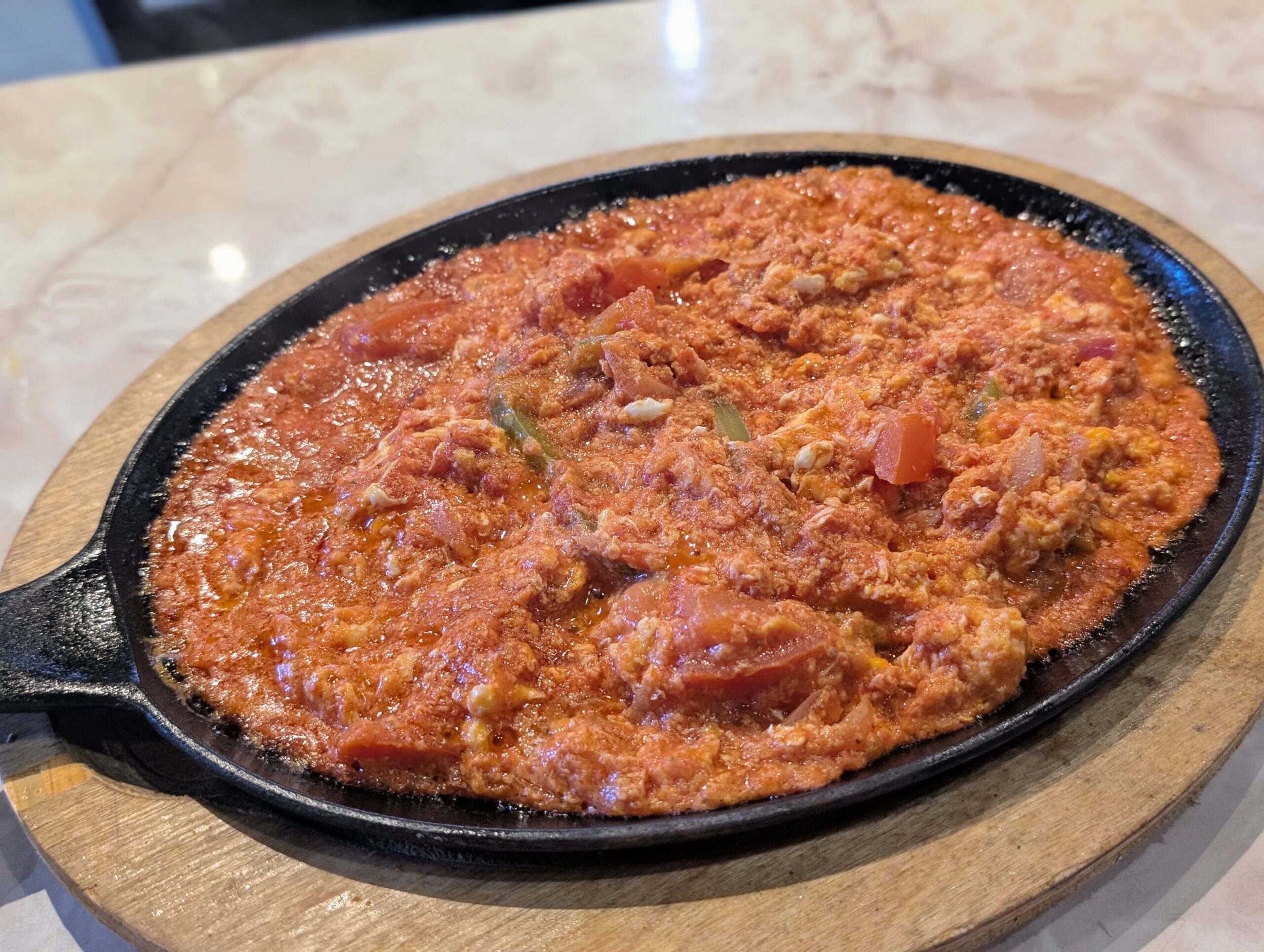 Đầu tiên là món khai vị trứng chiên với cà chua được dọn ra trên chảo gang để giữ nóng và được ăn chung với bánh mì. Trên chảo là trứng được đánh với cà chua rồi chiên mềm mại, có thêm chút ớt chuông xanh và hành tây. Trứng mềm mại, thơm phức mùi bơ, đầy vị chua ngọt tự nhiên của cà chua, kết hợp với vị ngọt của ớt và hành tây.