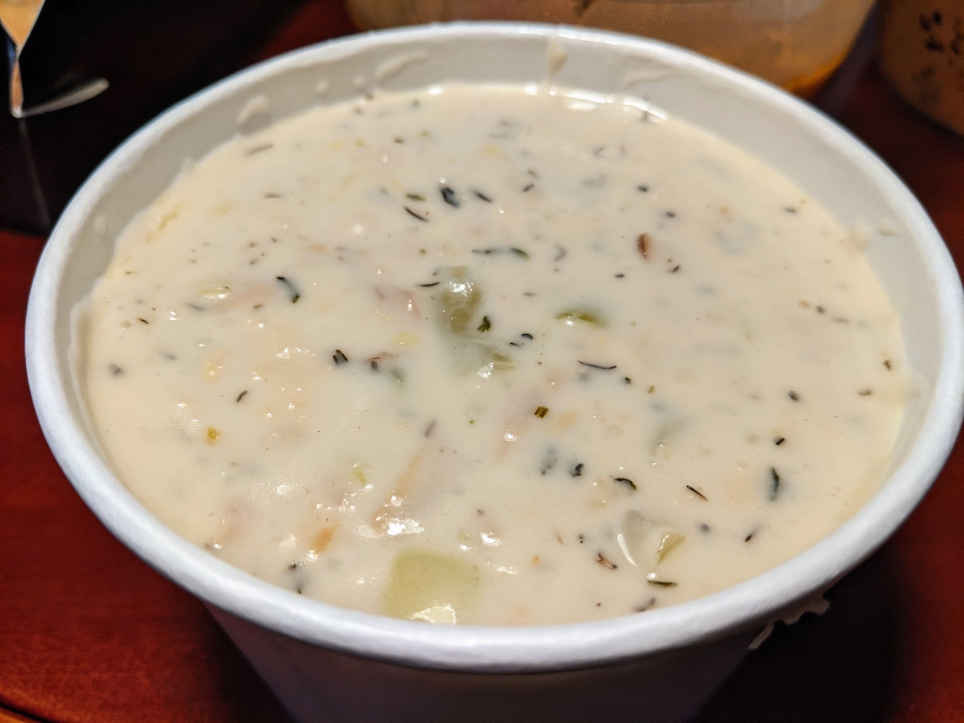 Ăn thử miếng bánh mì xong, tôi thử phần súp “clam chowder” trước. Đây là món súp rất phổ biến tại các nhà hàng Mỹ, có nghêu nấu với khoai tây, bacon và một số loại rau củ trong kem với sữa. Nước súp đặc sệt, thơm béo có vị nghêu đậm đà, lại có vị mặn mà rất hấp dẫn. Trong phần súp lại có thêm những viên khoai tây thơm bùi, thấm nước súp và tan ra trong miệng khi ăn. Tôi rất thích clam chowder ở San Francisco, và nghĩ nhà hàng Ritter’s nấu món này không hề thua kém.