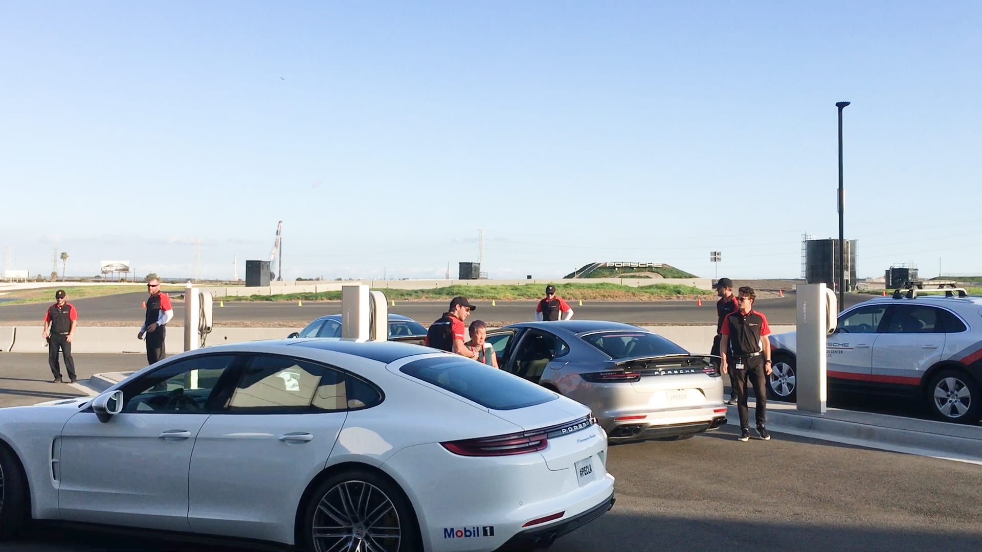 Các nhân viên tại Porsche Experience Center Los Angeles hướng dẫn khách tham quan tại đường chạy tốc độ cao. (Hình: Công Thành/Người Việt)