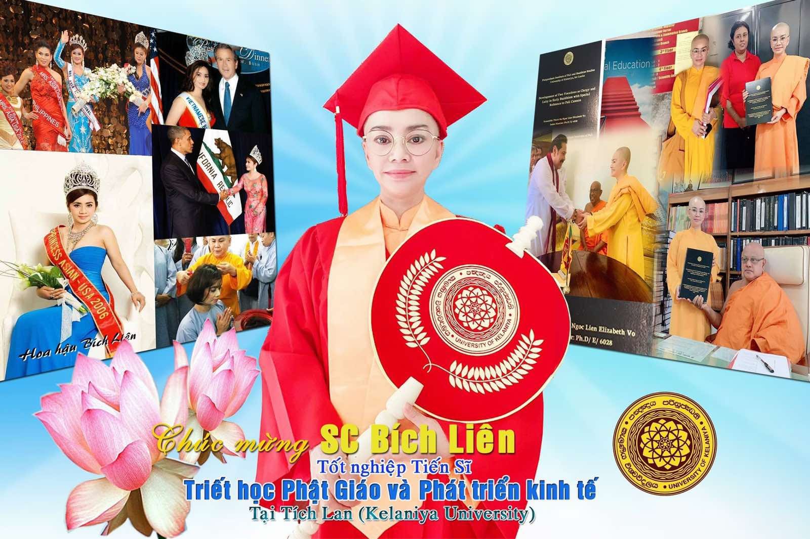 Sư Cô Thích Nữ Hoa LiênViện phó Pháp Viện Minh Đăng Quang giới thiệu đôi nét về Sư Cô Ngọc Liên: “…Hôm nay tôi rất vinh dự được đứng tại đây giới thiệu về Sư Cô Thích Nữ Ngọc Liên, Viện Chủ Pháp Viện Minh Đăng Quang, Tổ Đình Giác Nhiên. Sư Cô là một nhân vật vô cùng đặc biệt bởi vì từ khi còn là cô bé lọ lem được sinh ra tại huyện Dương Đông, đảo ngọc Phú Quốc, miền Nam- Việt Nam thân yêu chúng ta. Khi tuổi còn thơ ấu, Sư Cô đã rời xa vòng tay cha mẹ, tìm đường vượt biên sang Hoa Kỳ. Ý thức được sự côi cút nơi xứ người, Sư Cô đã cố gắng học hành, thay cha mẹ cưu mang và dìu dắt các em thơ dạitrưởng thành. Trải qua những năm tháng từ hai bàn tay trắng mà Sư Cô đã tạo dựng cho mình một sự thành danh rồi đứng trên đỉnh cao của vinh quang, trở thành một nữ doanh nhân thành đạt; một Hoa Hậu xinh đẹp nhân từ. Sư cô đã chia sẻ những gì mình có được cho những người bất hạnh, cúng dường Tam bảo, xây dựng chùa tháp, cầu đường xây nhà dưỡng lão. Có lẽ nhờ thiện căn sâu dày từ kiếp trước, Sư Cô luôn ý thức rằng cuộc sống là vô thường, tất cả đều là phù du giả tạm, nên Sư Cô đã từ bỏ tất cả để trở thành một Tỳ Kheo Ni đệ tử của Đức Phật và hiện diện giữa chúng ta hôm nay. Theo sự nhận xét của riêng tôi, Sư Cô Ngọc Liên là một người có đầy đủ tâm lực và trí lực để thực hiện những ước mơ của mình. Sống ở một xứ văn minh như Hoa Kỳ từ nhỏ, nên Sư Cô luôn ý thức được rằng, giáo dục vô cùng quan trọng, nó như một đôi cánh để con người có thể bay cao, bay xa hơn vào lãnh vực của tri thức. Khi bước vào đạo, Sư cô Ngọc Liên luôn ưu tư, là người đệ tử Phật cần phải học hỏi Giáo pháp để tu tập và làm hành trang trên bước đường hành đạo sau này, nên Sư Cô đãquyết định sang đảo quốc Tích Lan (Sri Lanka) tầm sư học đạo, dấn thân vào con đường học thuật. Thời gian trải dài sau hơn 4 năm, ngày 5 tháng 9, 2019 vừa qua, tại Đại học Kelaniya, thủ đô Colombo, Sri Lanka, Sư cô đã nhận được văn bằng Tiến Sĩ Triết học Phật giáo. Được biết Sư cô là một Tỳ Kheo Ni người Mỹ gốc Việt đầu tiên đã lấy được văn bằng Tiến Sĩ Triết Học Phật Giáo tại Đại học Kelaniya đảo quốc Sri Lanka. Hôm nay, tôi rất hãnh diện và tự hào về người huynh đệ khả ái và tài giỏi của mình. Xin trân trọng giới thiệu đến Chư Tôn đức cùng toàn thể quý vị đang hiện diện tại đây”.