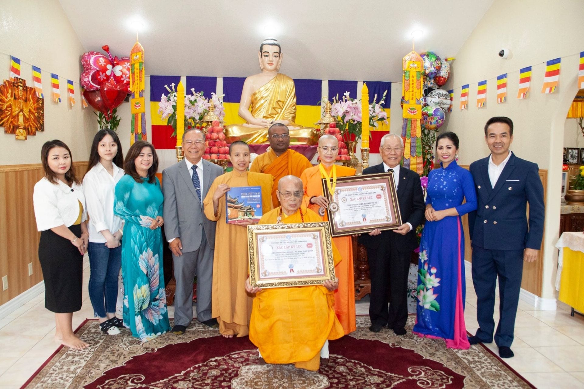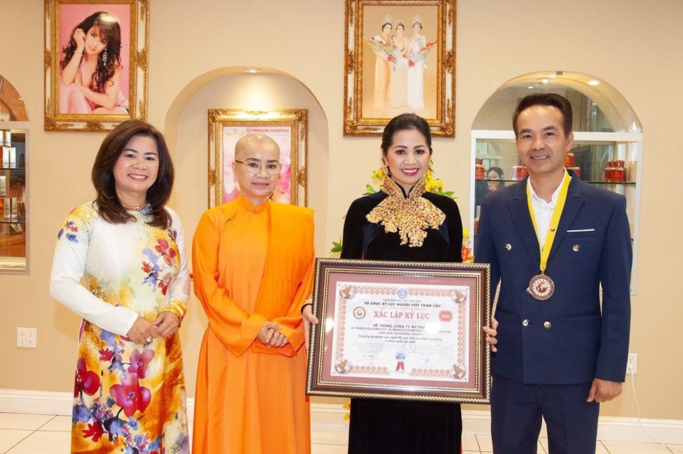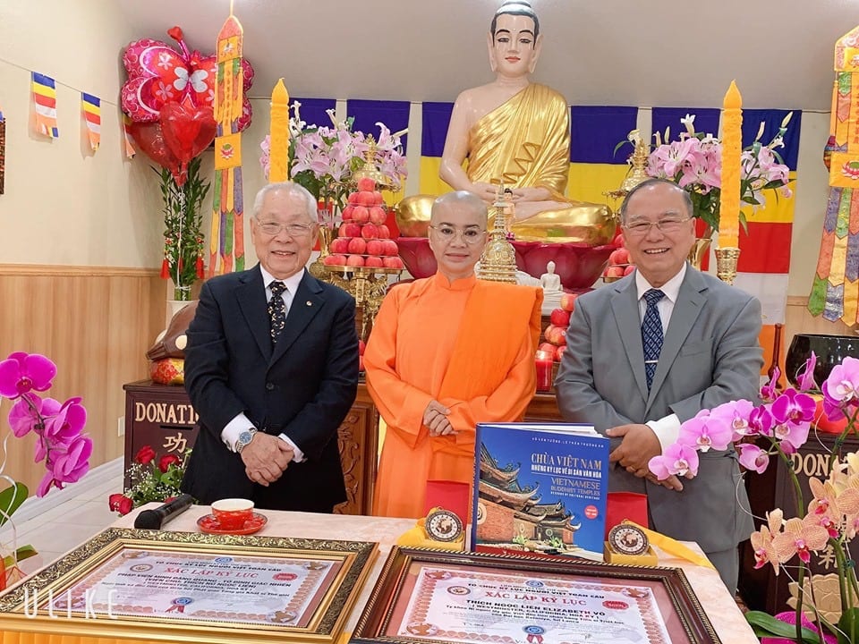 WESTMINSTER, California – Vào lúc 8 giờ 30 sáng Thứ Bảy, ngày 5 tháng 10 năm 2019, ông Hà Kim Vọng, thành viên Hội Đồng Xác Lập Kỷ Lục Tổ Chức Người Việt Toàn Cầu và giáo sư tiến sĩ Võ Văn Tường, Tổng Thư Ký Tổ Chức Kỷ Lục Người Việt Toàn Cầu đã đến Pháp Viện Minh Đăng Quang, Tổ Đình Giác Nhiên ở địa chỉ 8752 Westminster Blvd, Westminster CA 92683 để trao tận tay Sư Cô Ngọc Liên hai Văn Bằng Tưởng Lục Danh Dự và được ghi vào Sổ Bộ vĩnh viễn, cùng hai huy hiệu kỷ lục toàn cầu và cuốn sách “Chùa Việt Nam – Những Kỷ Lục Về Di Sản Văn Hóa).