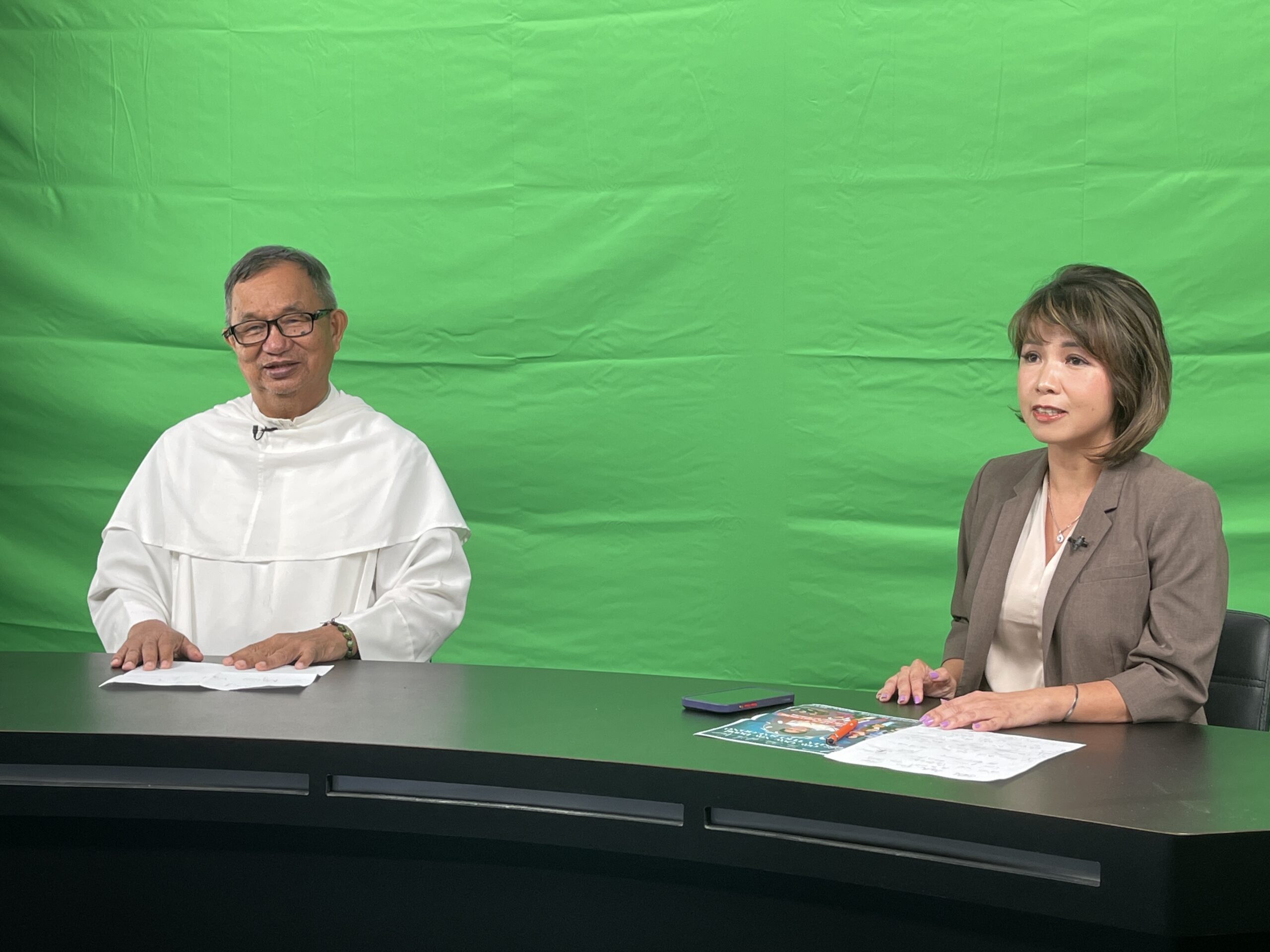 Linh Mục Phan Tự Cường (trái) trả lời phỏng vấn của biên tập viên Hoàng Vy trên Người Việt TV. (Hình: Đỗ Dzũng/Người Việt)