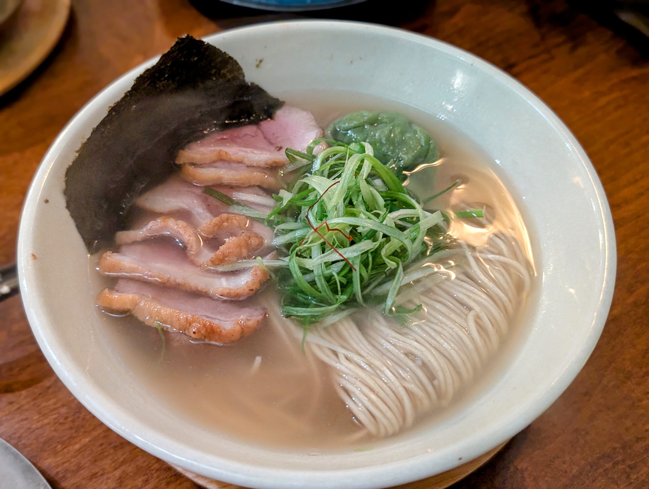 Món mì đầu tiên tôi thử là mì ramen với thịt vịt, có nước súp được nấu từ gà Jidori, vịt, nghêu, con hàu và rong biển. Sợi mì thì được chính tay ông chủ làm bằng bột lúa mạch kết hợp với mấy loại bột mì, vừa của Nhật vừa của Pháp, thêm vào đó là trứng vịt với trứng gà và mấy loại muối biển. Tô mì có những miếng ức vịt, một cái hoành thánh, có thêm măng khô và rong biển với hành lá tước sợi trong nước súp đặc biệt nhìn rất hấp dẫn.