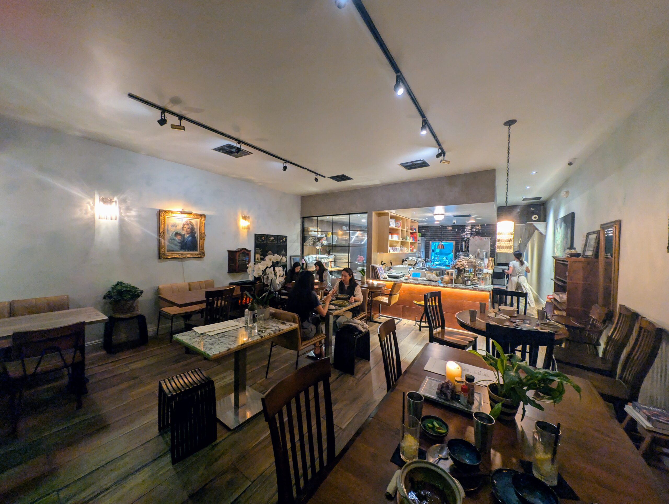 Khi vào bên trong nhà hàng nhỏ này, thực khách sẽ có cảm giác như vào một quán cà phê hay phòng khách của một gia đình vì có nhiều tranh ảnh được bày trí ngẫu hứng trong ánh đèn không quá sáng. Ngoài ra luôn có nhạc từ máy phát nhạc đĩa than thay đổi những bản nhạc tùy hứng của bà chủ với một chồng đĩa than trên quầy. Từ phòng ăn, thực khách có thể nhìn thấy phòng làm mì có máy nhập cảng từ Nhật, cho thấy ông bà chủ tự làm mì thật.
