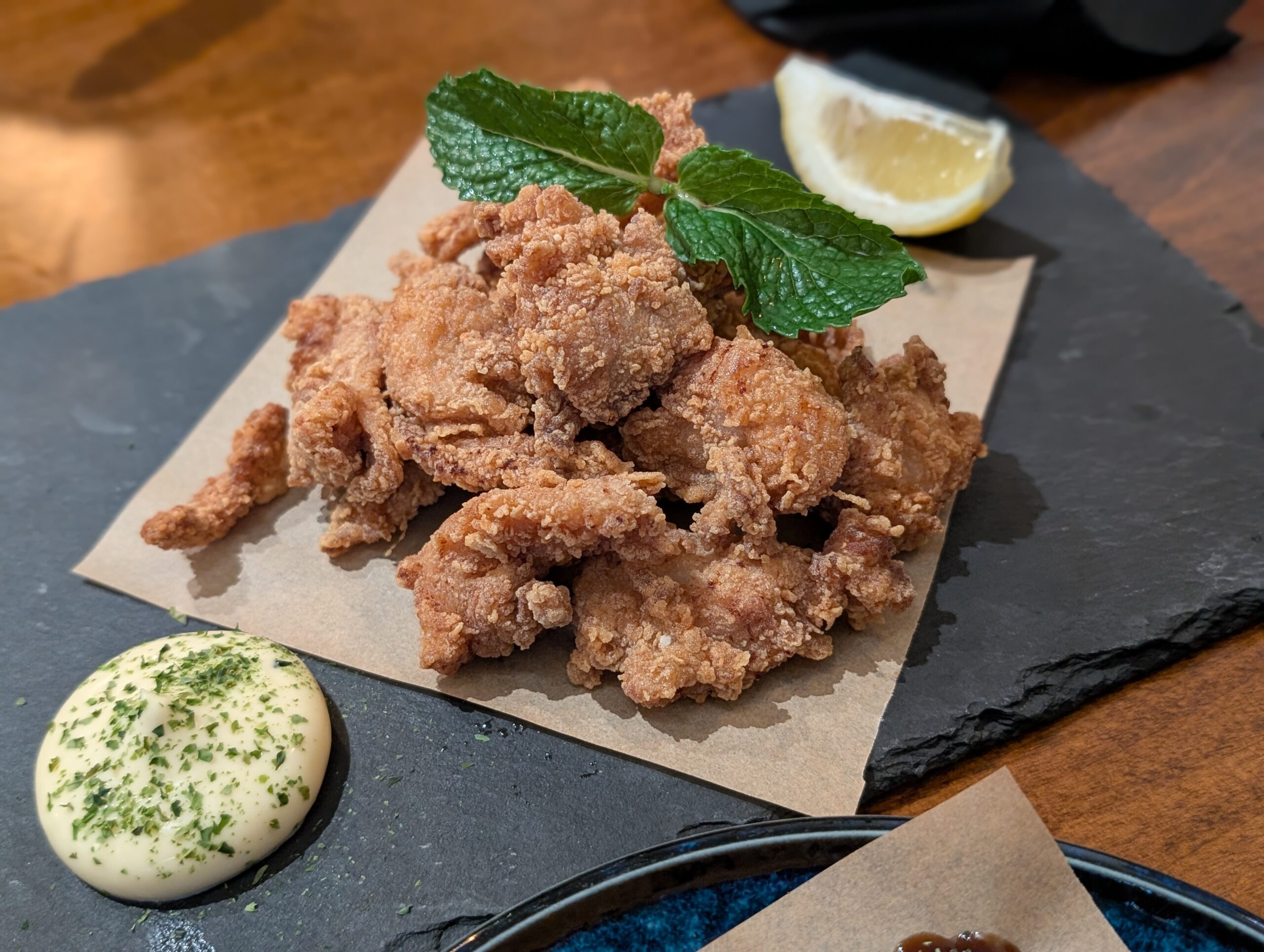 Tiếp theo là món gà chiên kiểu Nhật Bản, sử dụng thịt gà Jidori, là loại gà đi bộ được nuôi tự nhiên theo tiêu chuẩn của Nhật nên phẩm chất rất cao. Những miếng thịt gà được ướp gia vị rồi nhúng bột chiên giòn, sau đó ăn với chút chanh và nước xốt mayonnaise. Miếng gà chiên nào cũng có lớp bột thơm giòn, còn thịt gà bên trong thì đầy nước thịt đậm vị ngọt tự nhiên của gà, lại còn được ướp nhiều gia vị như xì dầu, gừng, tỏi và rượu nên rất thơm. Vị chua hơi gắt tự nhiên của chanh làm dịu đi vị béo của gà chiên, trong khi vị hơi béo với vị chua nhẹ của mayonnaise làm mọi mùi vị của gà trở nên đậm đà hơn.